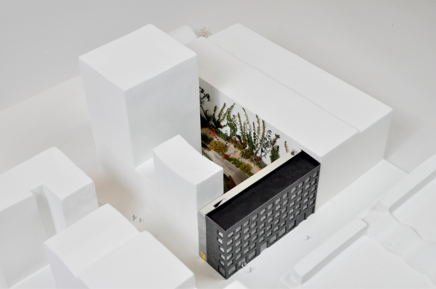 모퉁이 건물의 일부는 3미터 너비로 설정되어 주민들의 수직 이동 및 만남의 공간으로 기능하며, 금색 포털 입구와 스테인리스 메시로 마감되어 중정의 녹지와 조화를 이루는 등반 식물로 덮일 예정입니다.