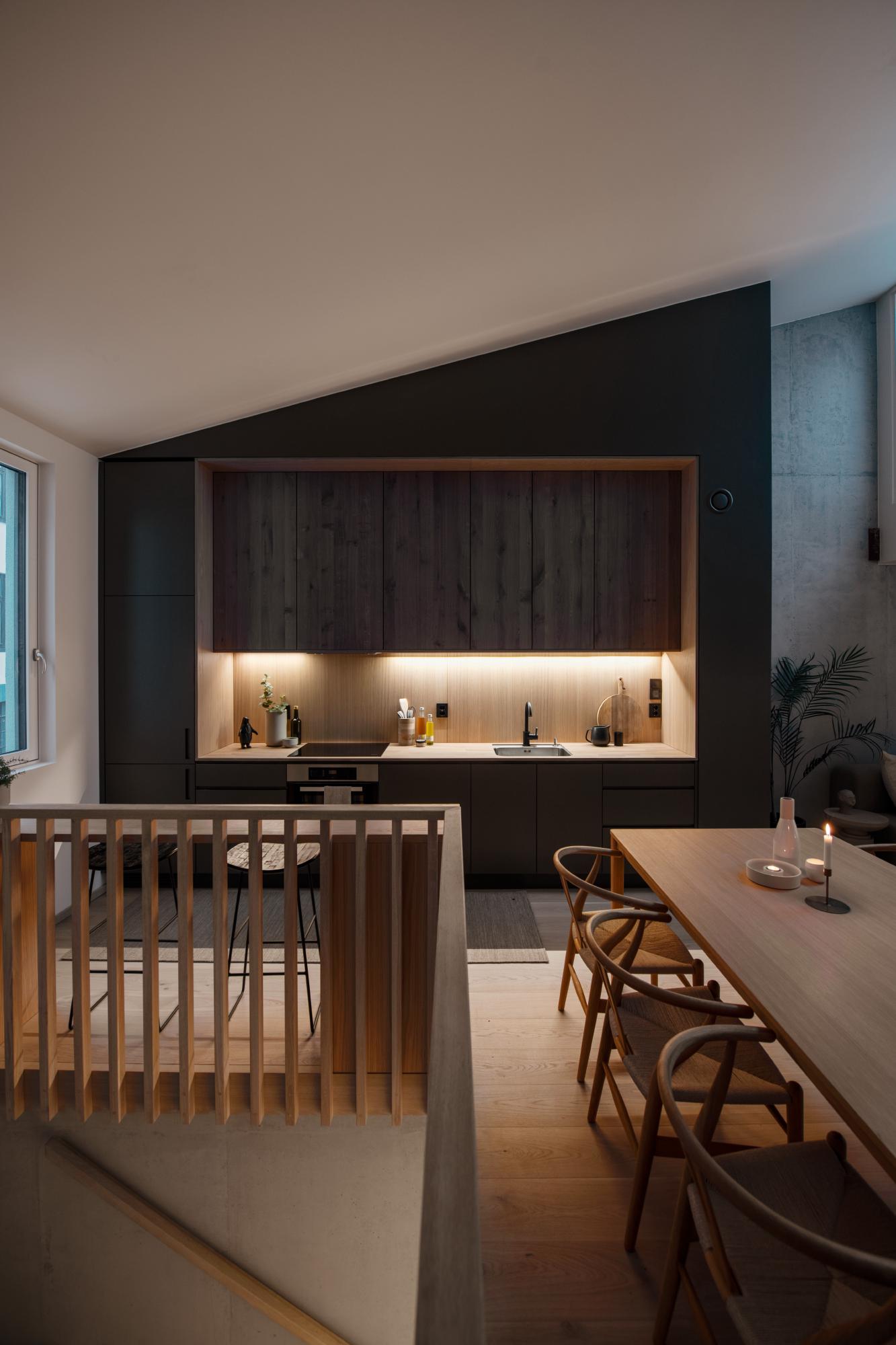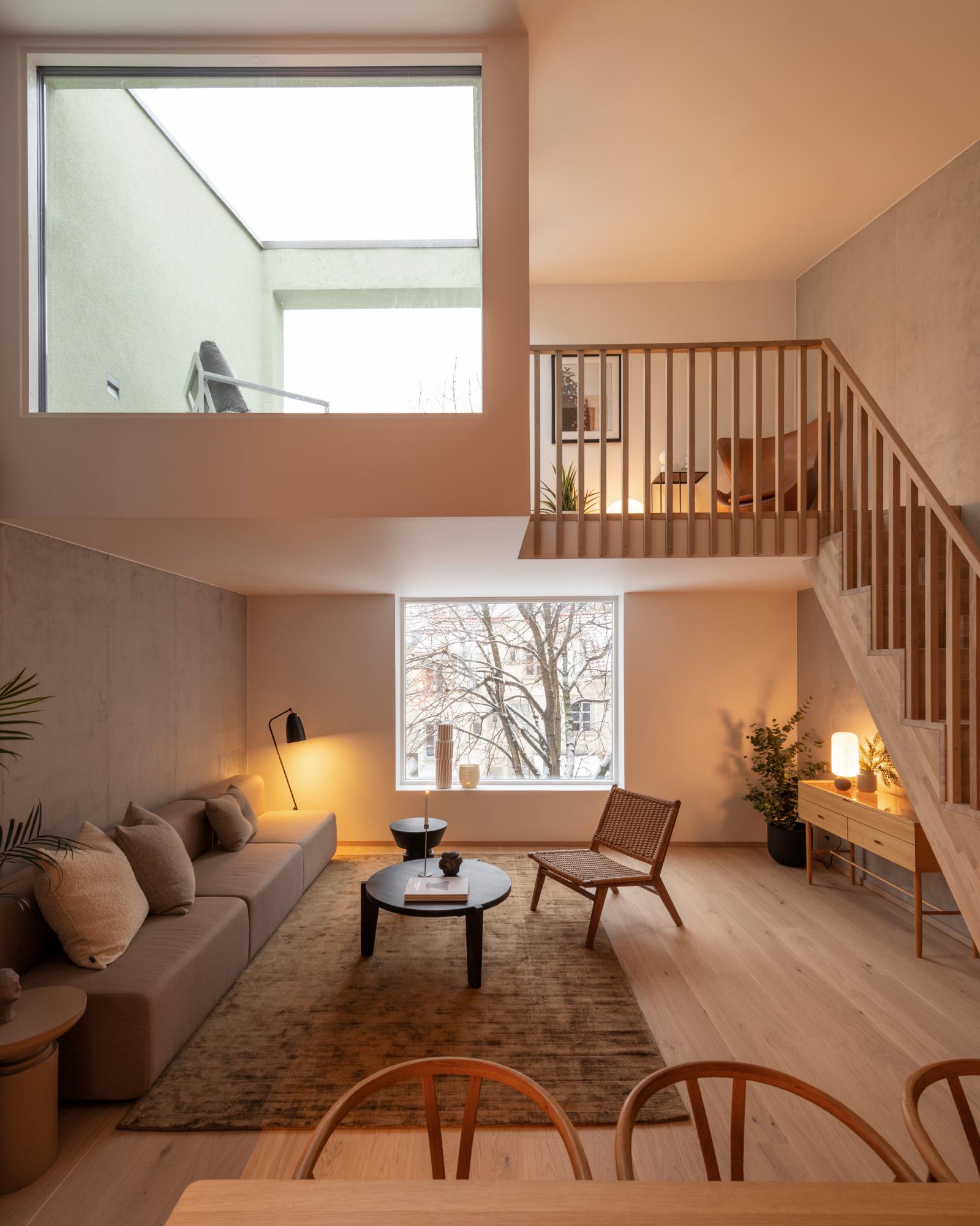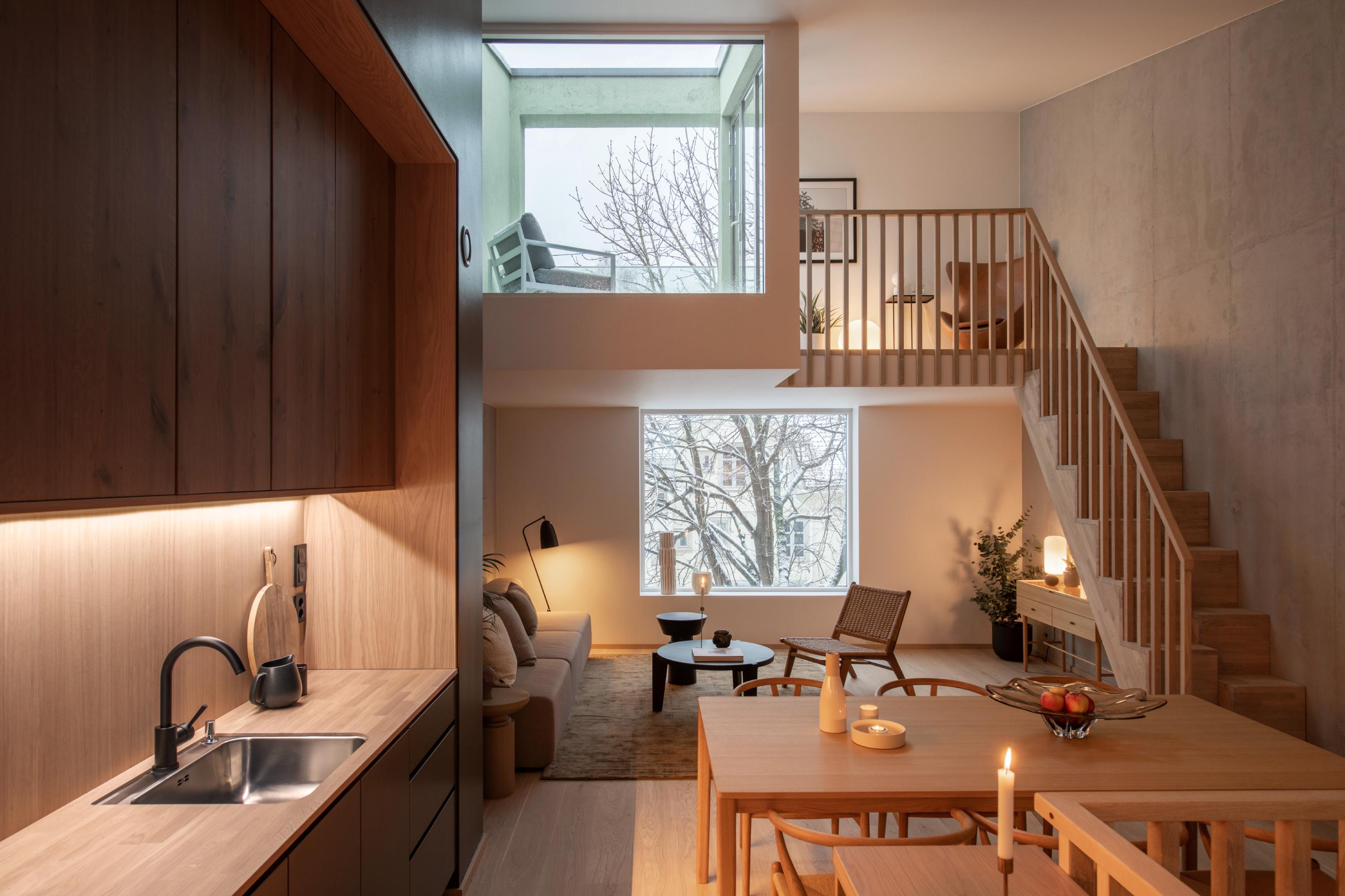 타운하우스의 색상 조합은 오슬로의 오래된 회반죽으로 덮인 벽돌 건물의 익숙한 색상 팔레트를 기반으로 하여 건물 전체에 더 세밀한 감각을 부여하며, 외부 재료와 함께 주변 환경과 조화로운 관계를 형성합니다. 내부에서는 주방, 계단, 바닥에 널리 사용된 목재가 부동산의 이전 용도를 상기시키며, 대담한 콘크리트 벽과 따뜻한 대비를 이룹니다.