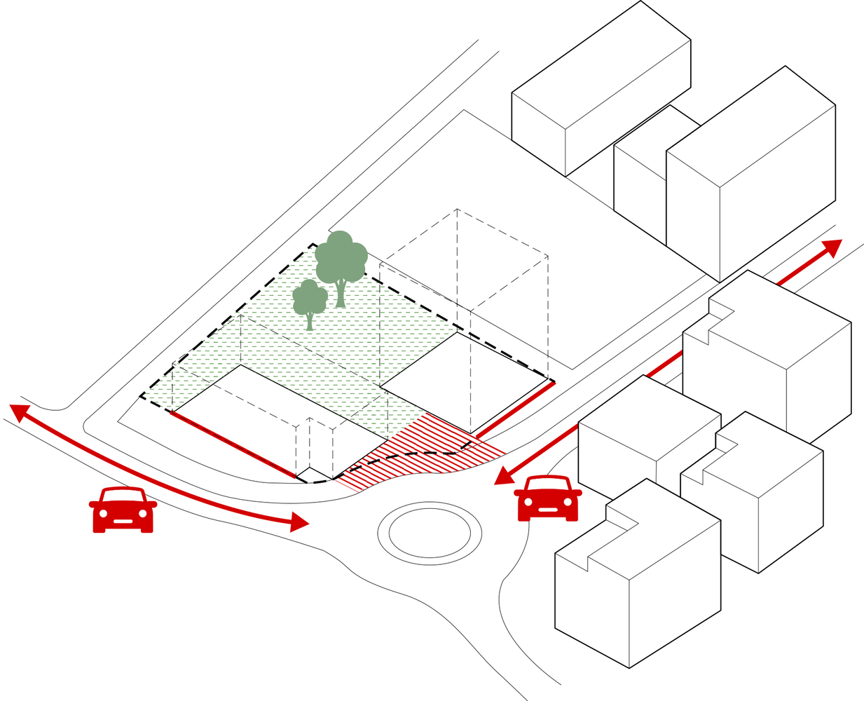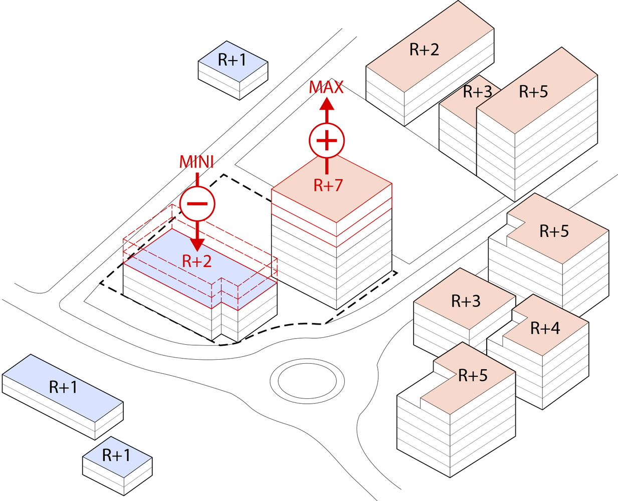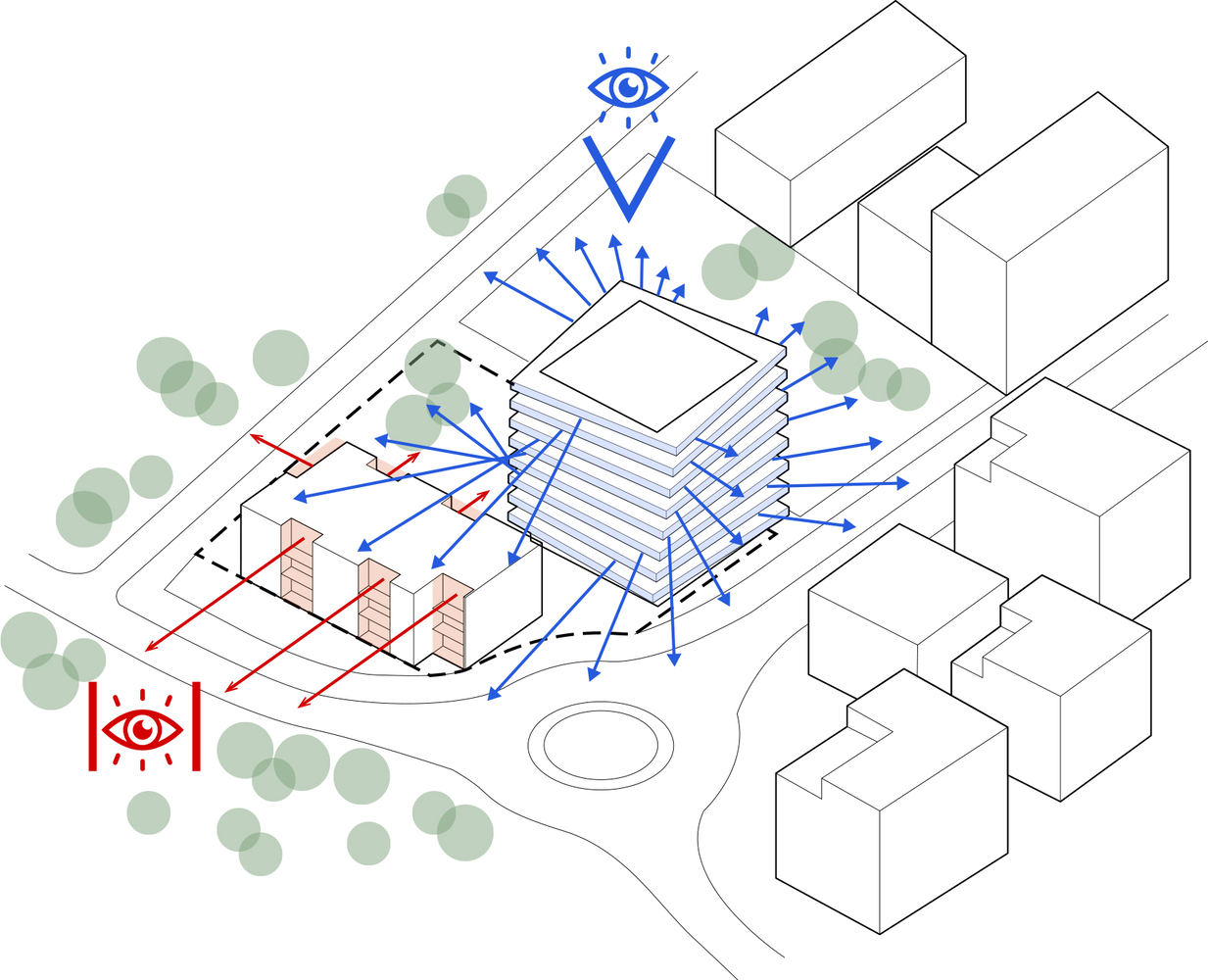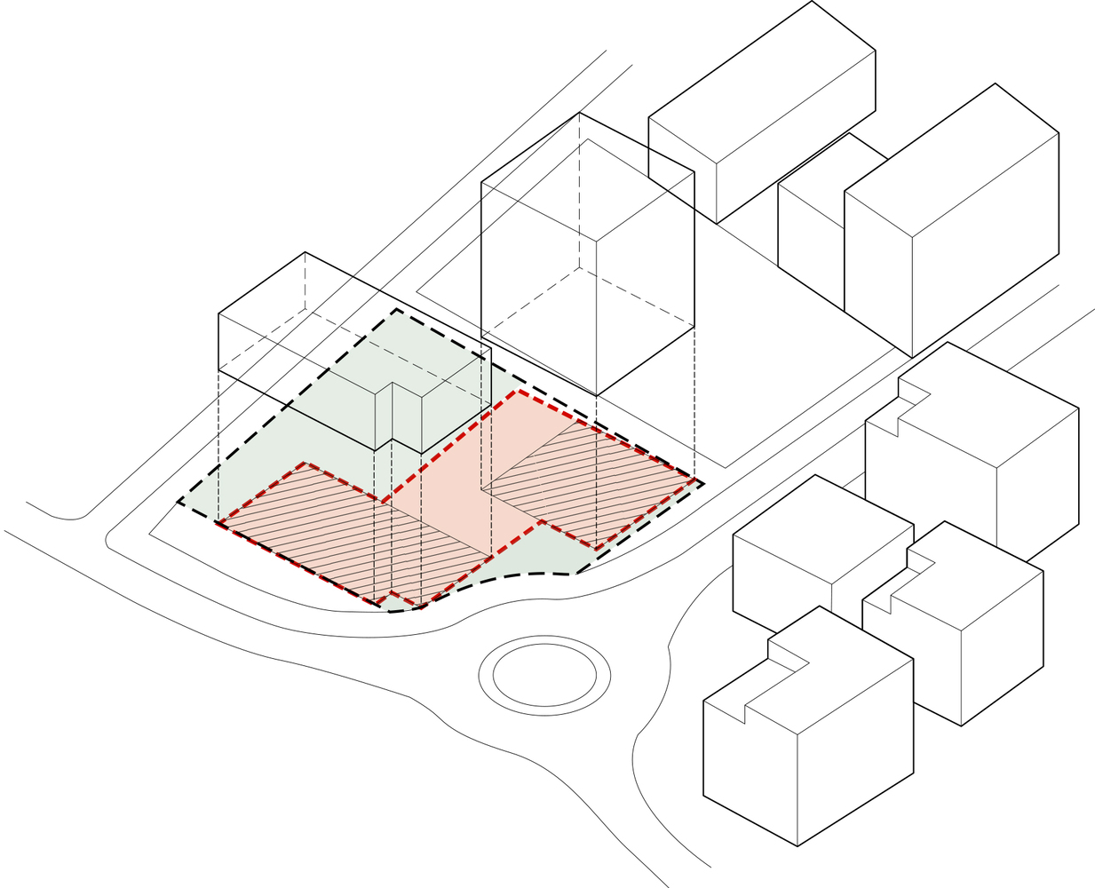 큰 건물: 최대 허용 높이까지 올라가며, 안뜰을 확보해 공용 공간이 탁 트이도록 설계되었습니다.