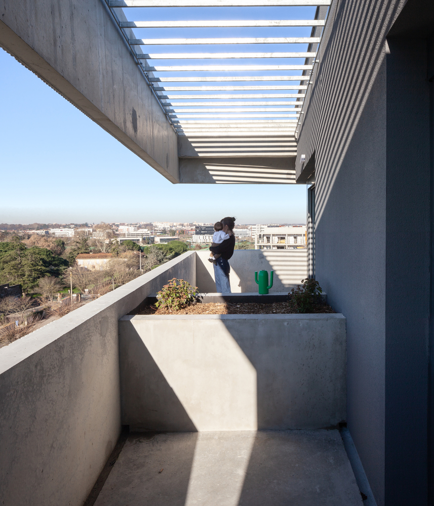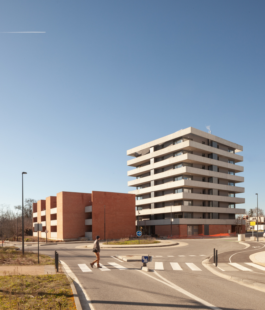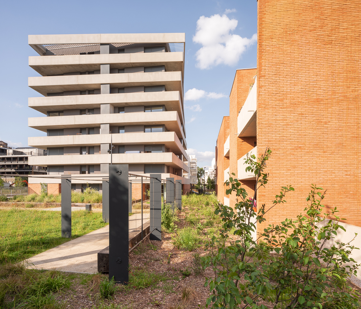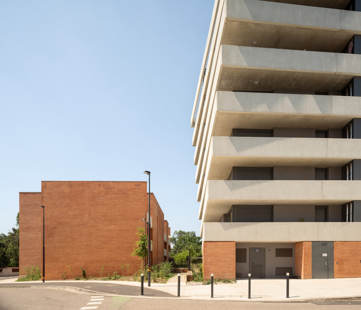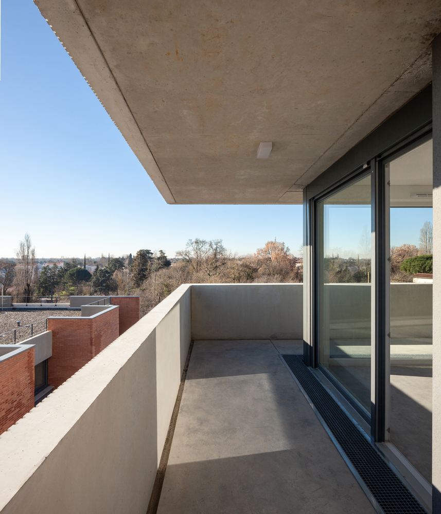 All the apartments in the project benefit from one or more distant views. The views from the R+2 building are directed, while those from the R+7 building are open and vary according to the height. The rotation of the balconies around a common core on all floors creates balconies with variable geometries. The green courtyard of the residence contributes to the landscape design of the development zone through its continuity with the retention basin. The latter can be seen between the R+2 and R+7 buildings, through the angled entrance hall. The large building is scaled to match the vast landscaped areas of the development zone. It is a tall collective building that residents can recognize from afar. It features balconies that conceal the large corner windows, which are not visible from the ground floor. It offers, admittedly, a classic way of living in a collective setting but provides a 'belvedere-living room' in each apartment (T3, T4). The small building reflects the scale of the villas in St. Martin du Touch, which border the south and east of the plot. It mixes the smallest apartments (T2) with the largest ones (T5). It offers a more individual way of living by protecting each apartment from noise and visual disturbances. Its architecture, composed of blind vertical brick masses, isolates the loggias from each other and borders the roundabout without impacting the residents. Side by side, the two buildings coexist harmoniously: the careful orientation of the apartments in the small building avoids direct views into neighboring apartments and offers the opportunity to enjoy distant views.