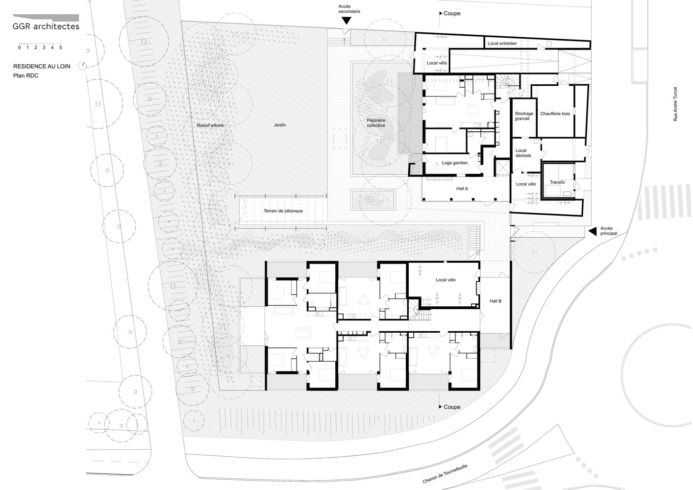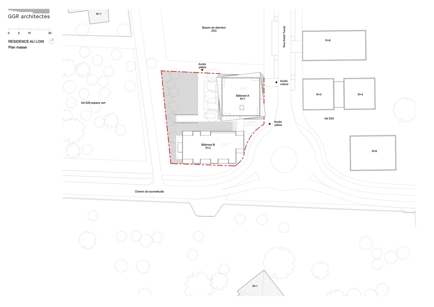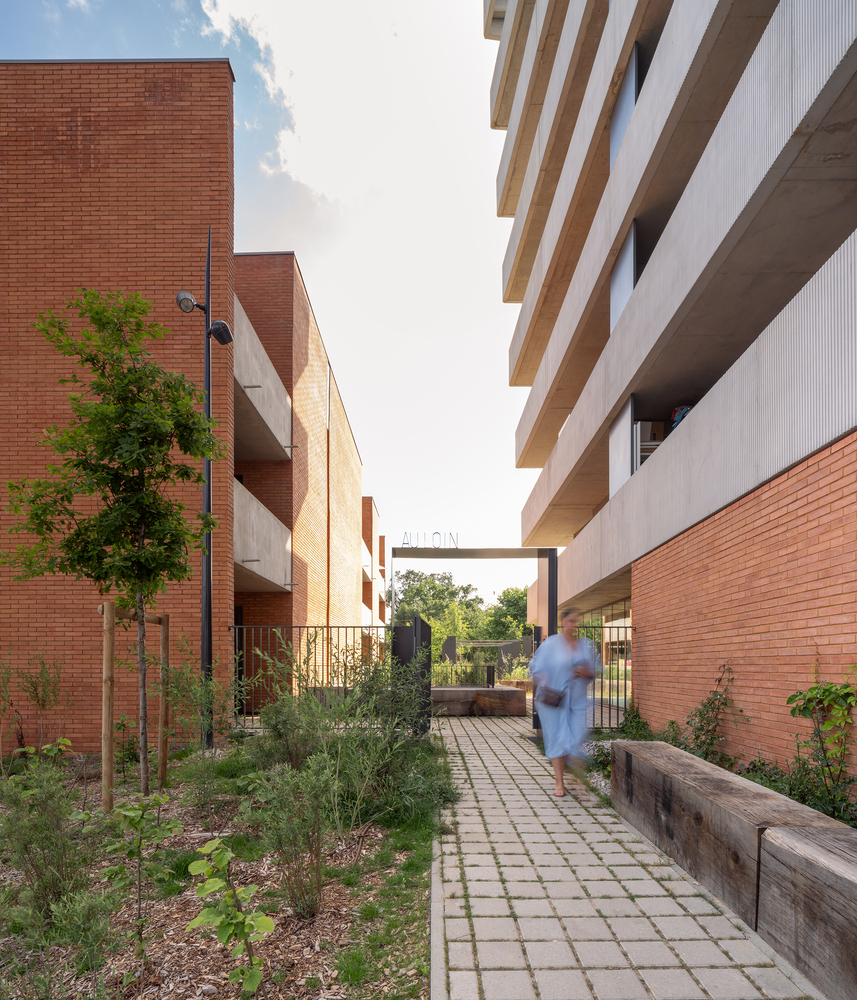 The residence Au Loin is part of a new development zone on the outskirts of Toulouse. It is intended to be representative of innovation in construction and the housing of tomorrow. However, it doesn't invent anything. It also does not revolutionize the way of living. The primary concern of the residence Au Loin is to offer a new landscape for each of its homes. To achieve this, it is shaped by simple siting principles and architectural choices that have stood the test of time. Reflecting the values of the GGR agency, the Au Loin project aims to be economical, sustainable, timeless, and human-centered. Because a city cannot be built solely on achievements. The project aims to take advantage of the landscape qualities of a complex urban context: a narrow corner plot, located on the edge of the main axis of a developing neighborhood and bordering a wooded area and a 'wild' stream. To achieve this, two buildings are constructed along the street to protect the common garden from road nuisances. A large building rises to the maximum permitted height to free up the ground and allow the inner courtyard to breathe. A smaller building is lowered to engage in dialogue with the neighboring residential fabric. The space between the two buildings forms the entrance to the residence. The void of the central garden connects with the void of the retention basin of the development zone, giving residents the impression that their common garden is immense.