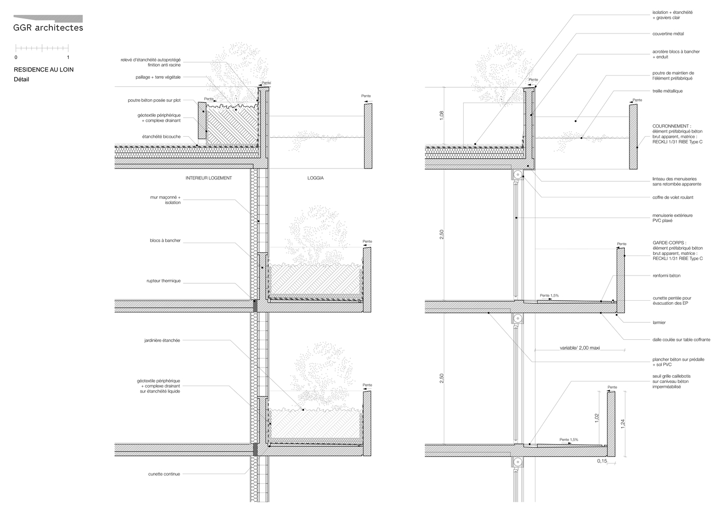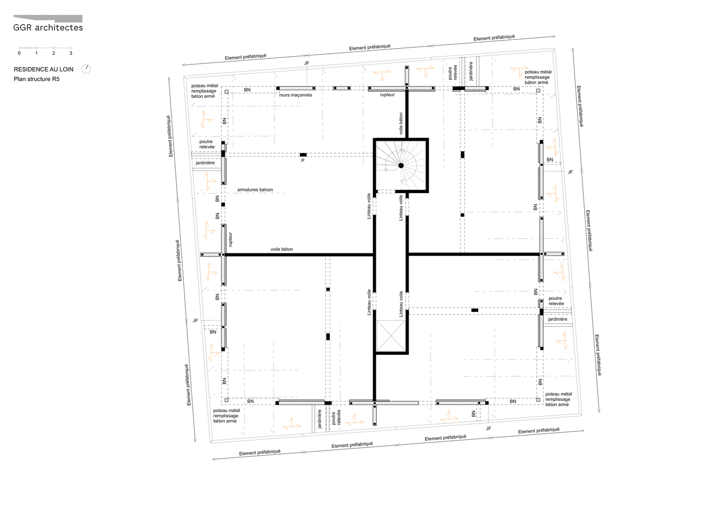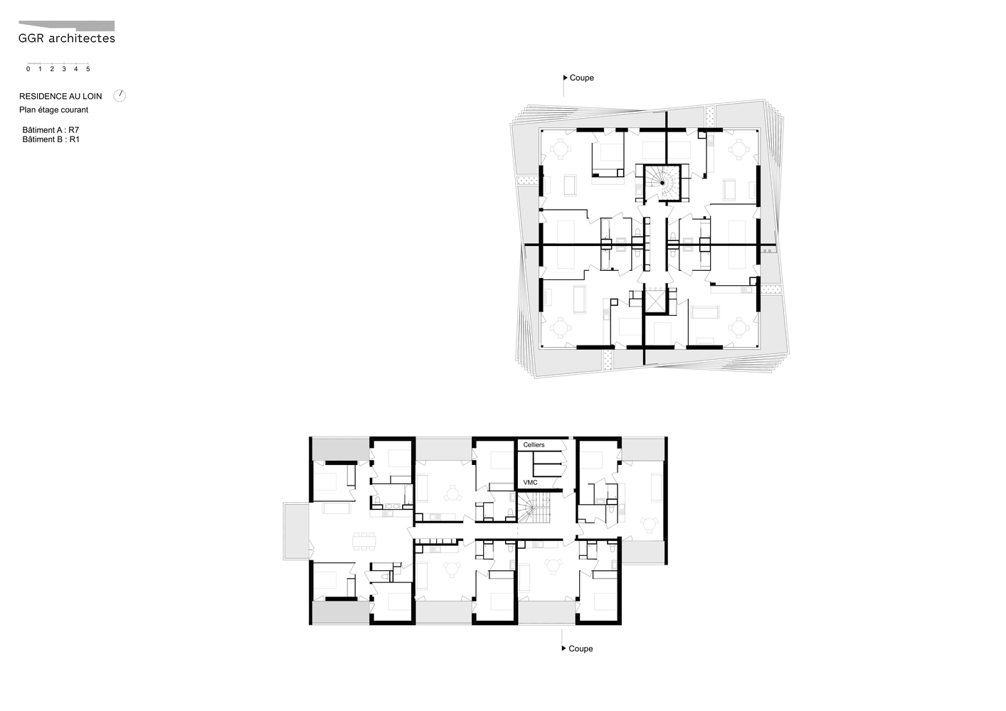 The residence Au Loin is part of a new development zone on the outskirts of Toulouse. It is intended to be representative of innovation in construction and the housing of tomorrow. However, it doesn't invent anything. It also does not revolutionize the way of living. The primary concern of the residence Au Loin is to offer a new landscape for each of its homes. To achieve this, it is shaped by simple siting principles and architectural choices that have stood the test of time. Reflecting the values of the GGR agency, the Au Loin project aims to be economical, sustainable, timeless, and human-centered. Because a city cannot be built solely on achievements. The project aims to take advantage of the landscape qualities of a complex urban context: a narrow corner plot, located on the edge of the main axis of a developing neighborhood and bordering a wooded area and a 'wild' stream. To achieve this, two buildings are constructed along the street to protect the common garden from road nuisances. A large building rises to the maximum permitted height to free up the ground and allow the inner courtyard to breathe. A smaller building is lowered to engage in dialogue with the neighboring residential fabric. The space between the two buildings forms the entrance to the residence. The void of the central garden connects with the void of the retention basin of the development zone, giving residents the impression that their common garden is immense.