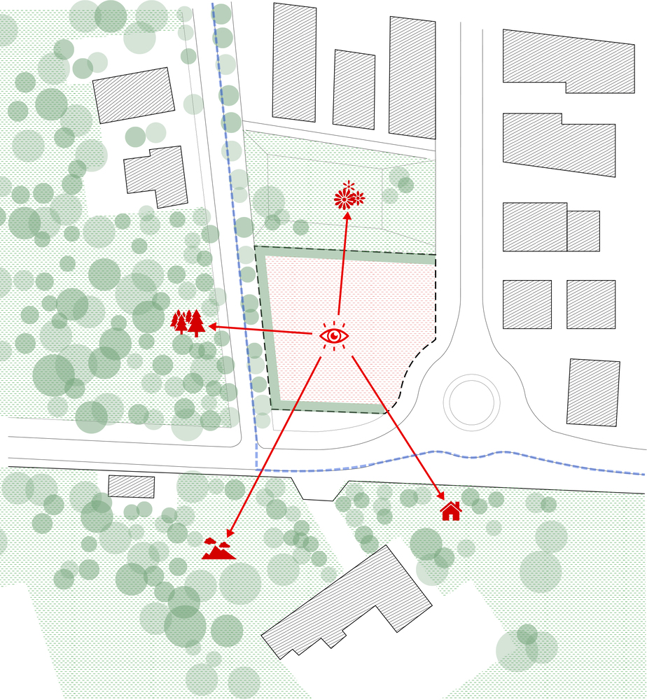 Au Loin 프로젝트는 주변 환경과의 조화를 중요시합니다. 협소한 모서리 부지에 위치하며, 개발 중인 지역의 주요 도로와 인접한 숲, 자연 하천과 접해 있습니다. 이를 고려해 두 개의 건물을 도로를 따라 배치해 공용 정원을 도로 소음으로부터 보호하고, 높이를 조절해 각기 다른 높이의 풍경을 제공합니다.