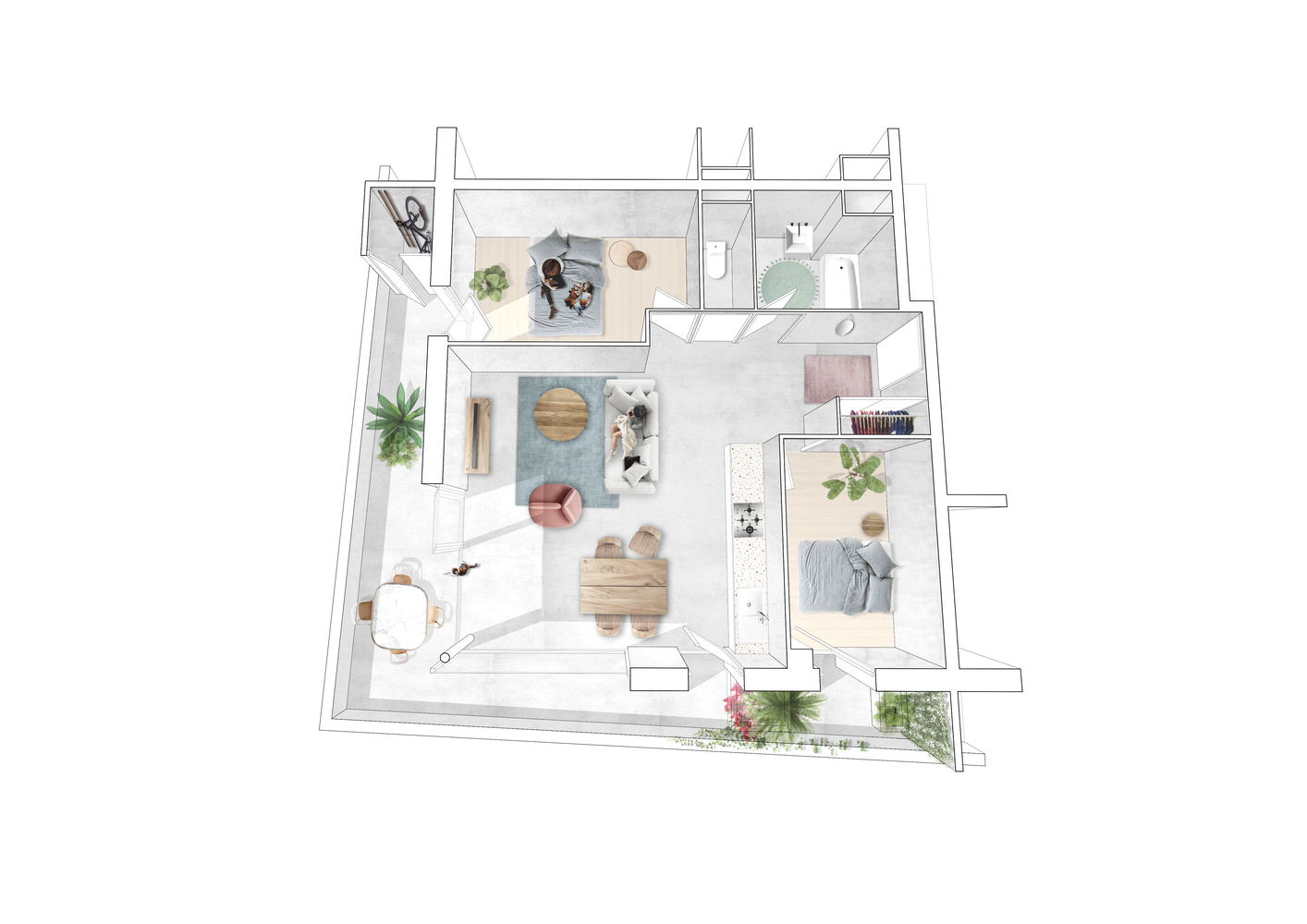 작은 아파트(T2)와 큰 아파트(T5)가 함께 위치하며, 소음과 시각적 방해로부터 보호되는 프라이빗한 주거 공간을 제공합니다.