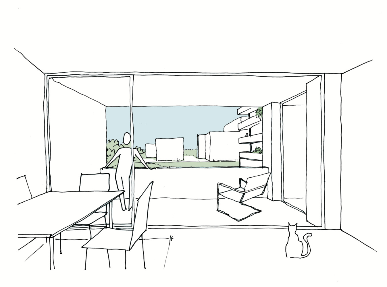 The small building and the large one are different. Their unique architecture, side by side, helps manage the visual relationships between the apartments. The large building radiates 360°. The small building opens towards the open views and closes off on the side facing the neighboring building and the roundabout. However, both architectures follow similar principles. The glass windows are set back, behind balconies or loggias, blending into the background to highlight the brick and concrete masses. Far from the classic design of residential buildings where windows express domestic use, the 'Au Loin' residence is made up of blind vertical brick volumes and thick horizontal concrete layers. These masses protect the apartments from urban nuisances. Yet, they open generously to the surrounding landscape, each in its own way. The corner apartments of the large building and the framed, oriented apartments of the small building offer two different ways of living. The architecture of each building is a direct expression of the quality of its apartments.