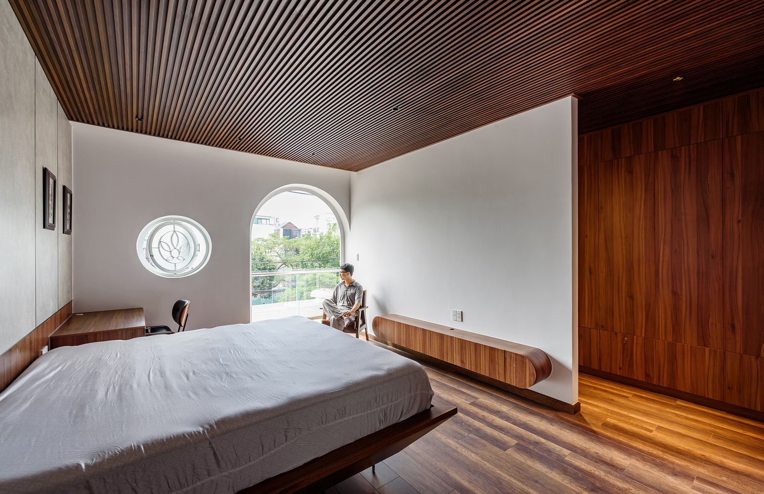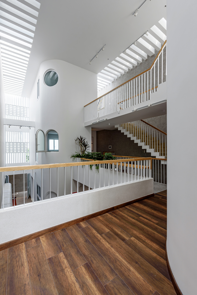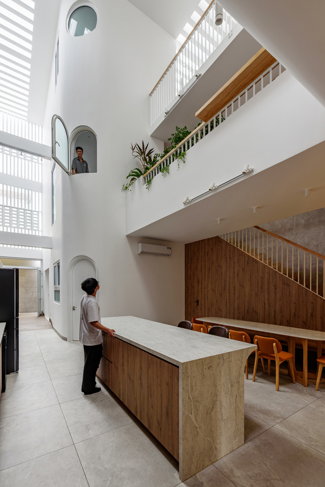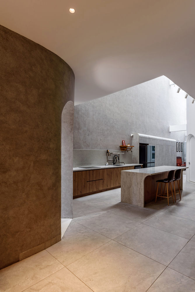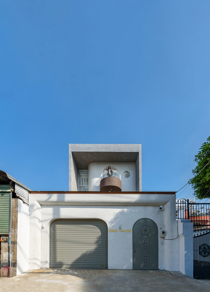 Dinh House의 공간은 ‘숲 속에서의 캠핑’이라는 경험에서 출발했습니다. 절벽 사이 좁은 틈으로 빛이 스며드는 한 장면. 숭고한 자연 속에서 인간은 한없이 작고, 덧없는 존재로 느껴집니다. 그 틈새로 들어오는 빛은 단순한 채광이 아니라, 존재에 대한 질문을 던지는 통로와도 같습니다. 이러한 감각을 집의 구조에 녹여내기 위해, 우리는 단단한 직육면체 매스 안에 앞뒤로 원기둥 형태의 볼륨 두 개를 배치했습니다. 그리고 집의 양 옆에 ‘빛과 바람이 흐르는 틈’을 만들었습니다. 이 틈은 빛이 들어오는 통로이자 공기가 흐르는 길입니다. 빛은 이 슬릿을 통해 내부 공간으로 들어오고, 원기둥 표면을 따라 공간을 휘감으며 감각을 자극합니다. 그 빛은 마치 곡면을 타고 공간 속으로 빨려 들어갔다가 다시 터널 끝의 희망처럼, 집 안 곳곳으로 퍼져나갑니다. 매일 아침, 집 안으로 쏟아지는 빛은 단지 시각적인 요소를 넘어서, 삶에 대한 경외감과 기대를 일으키는 경험이 됩니다.