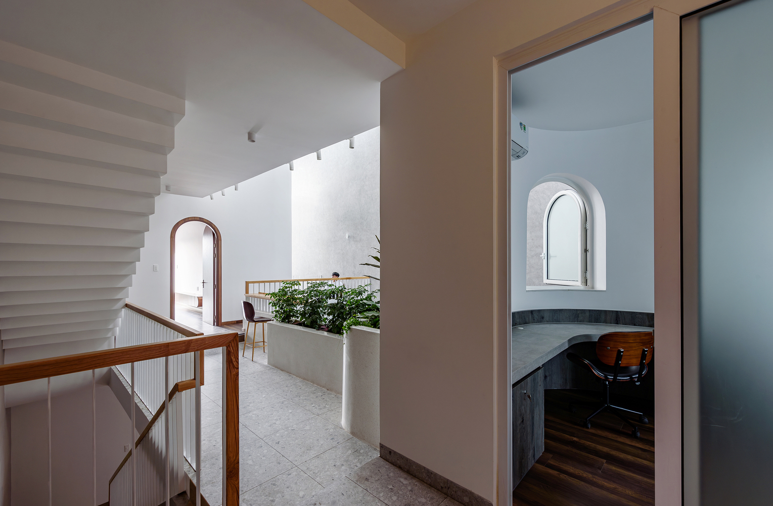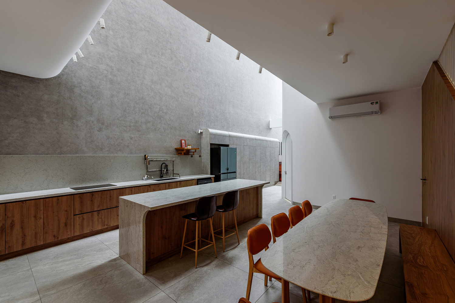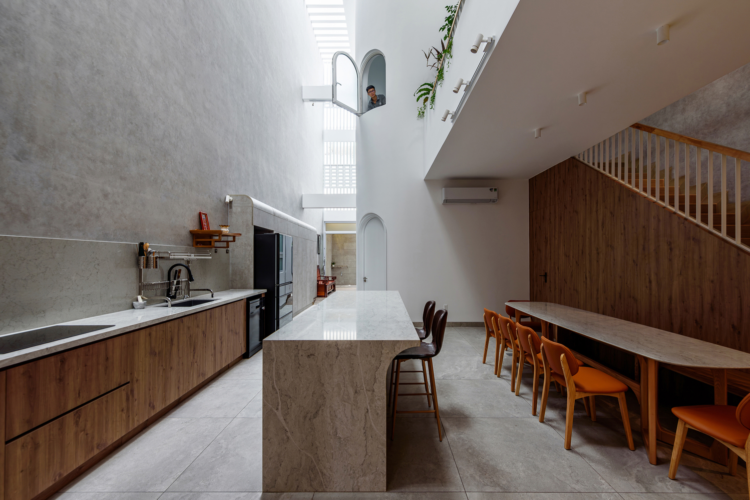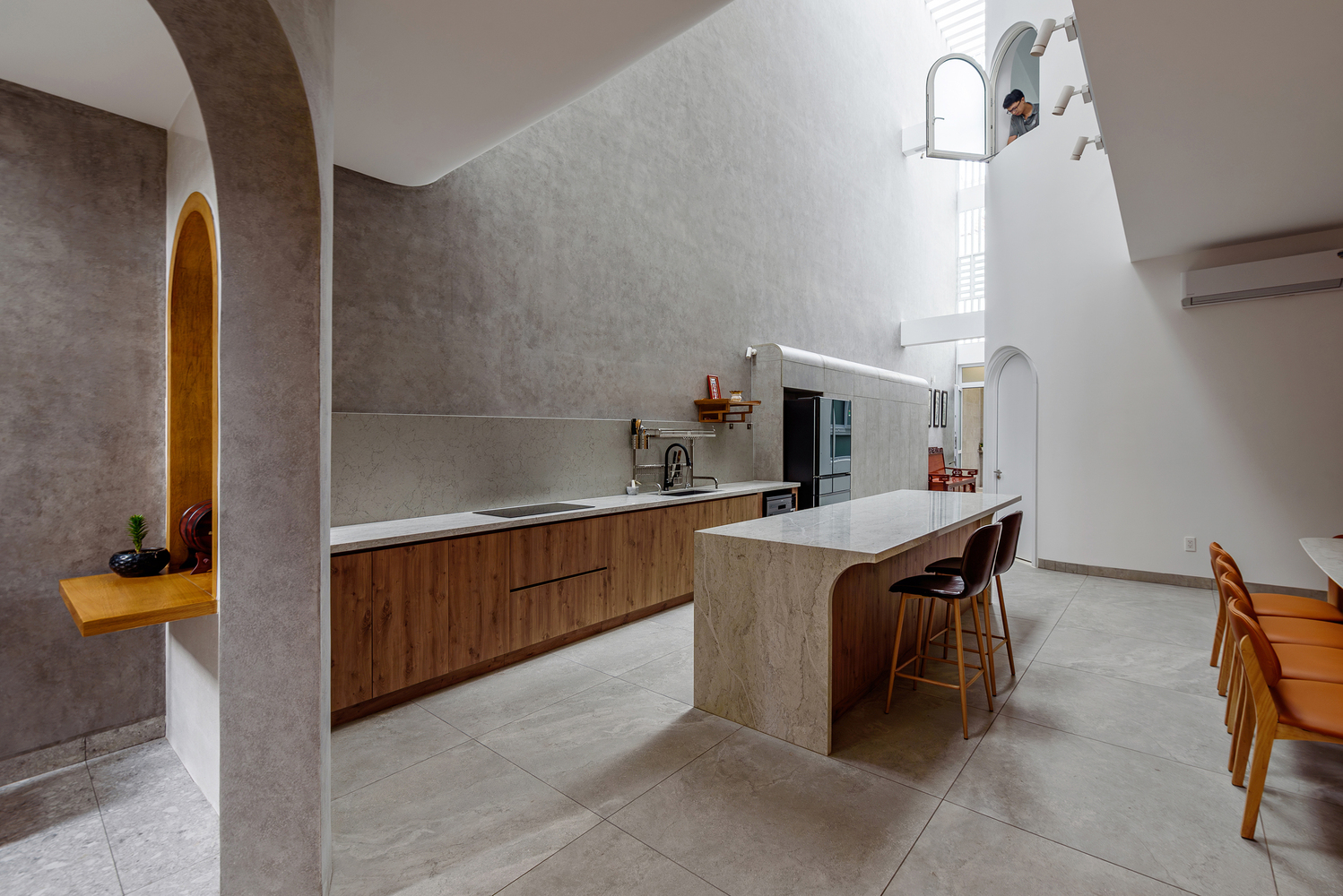 Dinh House의 공간은 ‘숲 속에서의 캠핑’이라는 경험에서 출발했습니다. 절벽 사이 좁은 틈으로 빛이 스며드는 한 장면. 숭고한 자연 속에서 인간은 한없이 작고, 덧없는 존재로 느껴집니다. 그 틈새로 들어오는 빛은 단순한 채광이 아니라, 존재에 대한 질문을 던지는 통로와도 같습니다. 이러한 감각을 집의 구조에 녹여내기 위해, 우리는 단단한 직육면체 매스 안에 앞뒤로 원기둥 형태의 볼륨 두 개를 배치했습니다. 그리고 집의 양 옆에 ‘빛과 바람이 흐르는 틈’을 만들었습니다. 이 틈은 빛이 들어오는 통로이자 공기가 흐르는 길입니다. 빛은 이 슬릿을 통해 내부 공간으로 들어오고, 원기둥 표면을 따라 공간을 휘감으며 감각을 자극합니다. 그 빛은 마치 곡면을 타고 공간 속으로 빨려 들어갔다가 다시 터널 끝의 희망처럼, 집 안 곳곳으로 퍼져나갑니다. 매일 아침, 집 안으로 쏟아지는 빛은 단지 시각적인 요소를 넘어서, 삶에 대한 경외감과 기대를 일으키는 경험이 됩니다.