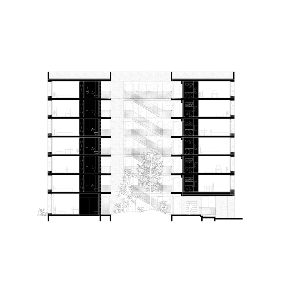 이번 프로젝트의 대지는 특별한 비율을 가지고 있어, 전형적인 복도 양쪽으로 방이 나열된 형태를 뛰어넘는 설계를 가능하게 했습니다. 대신, 이 건물의 중심에는 야외 파티오가 자리합니다. 파티오를 중심으로 외부 순환 통로가 감싸며, 각 건물 사이의 틈을 통해 새로운 도시 풍경을 끊임없이 프레이밍합니다. 이 개방된 통로들은 자연 환기를 촉진하고, 학생들의 방은 거리와 파티오 양쪽으로 열리면서 공간을 관통합니다. 파티오에 조성된 녹지와 그늘 덕분에, 기숙사는 이 지역에 소중한 신선함의 섬을 제공합니다.