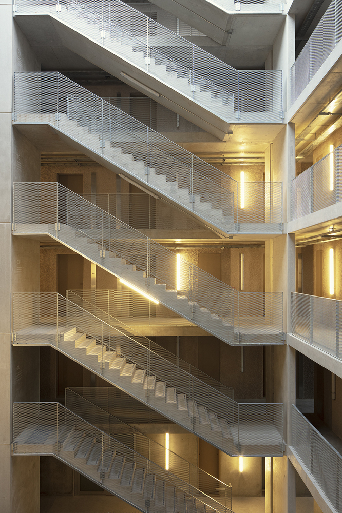 공용 공간은 대부분 외부에 노출되어 있어 별도의 난방이나 냉방이 거의 필요 없습니다. 이는 에너지 소비를 크게 줄이고, 장기적인 유지관리를 용이하게 합니다. 파사드는 하나의 창을 반복적으로 배치해 단순하지만 강렬한 인상을 남깁니다. 창의 깊이를 강조해 햇빛을 차단하면서, 가늘고 긴 볼륨을 더욱 추상적이고 입체적으로 표현했습니다.