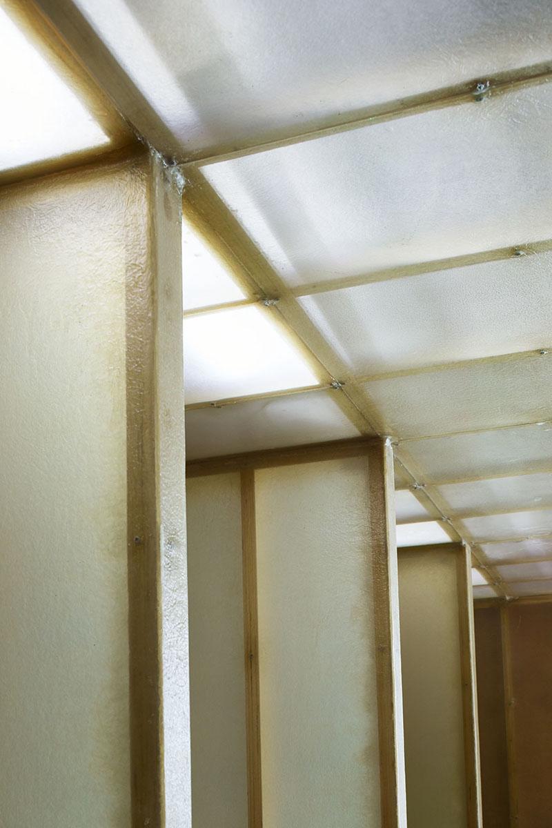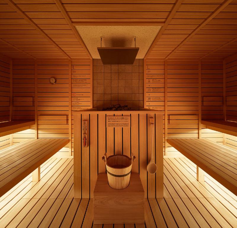 The sauna was originally imported from Finland to Japan, which later evolved locally and a distinct combination of the sauna and cold bath for cooling down was established. Cooling down process is very important when using a sauna. Here shower faucets called "Warm Pillar" (manufactured by TOTO) with a temperature controlling function are used for cooling down. The method called "löyly", which is common in Finland, is adopted to create authentic saunas. The space connecting the shower room and the sauna area is entirely finished with clear FRP (fiber reinforced plastic) from floor to wall to ceiling for waterproofing. In addition, the existing surface finishes on the stairs in front of the building were completely removed to expose the structural members, which were then repainted with anti-corrosive paint for maintenance. The entire building was also painted in the same color as the anti-corrosive paint, which was designated as the signature color.