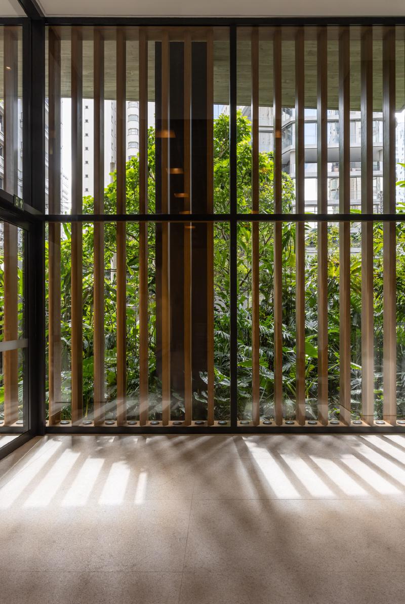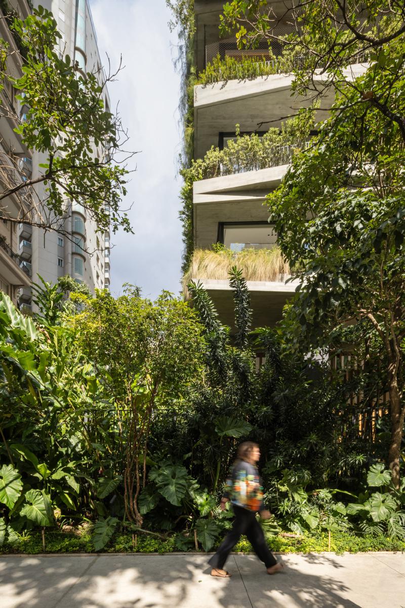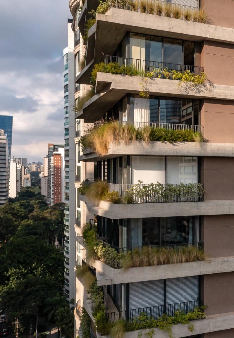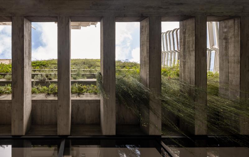 모든 층의 슬래브를 따라 파사드에 플랜터를 통합함으로써, 녹지는 장식 요소가 아닌 건축을 구성하는 핵심 요소로 작동한다. 조경은 일조, 바람, 미기후를 고려해 설계되었고, 브라질 토착 식물을 중심으로 한 다양한 식재가 연중 변화하는 살아 있는 입면을 만든다. 자동 점적 관수와 고배수성 토양 시스템을 통해 유지 관리 효율도 확보했다.