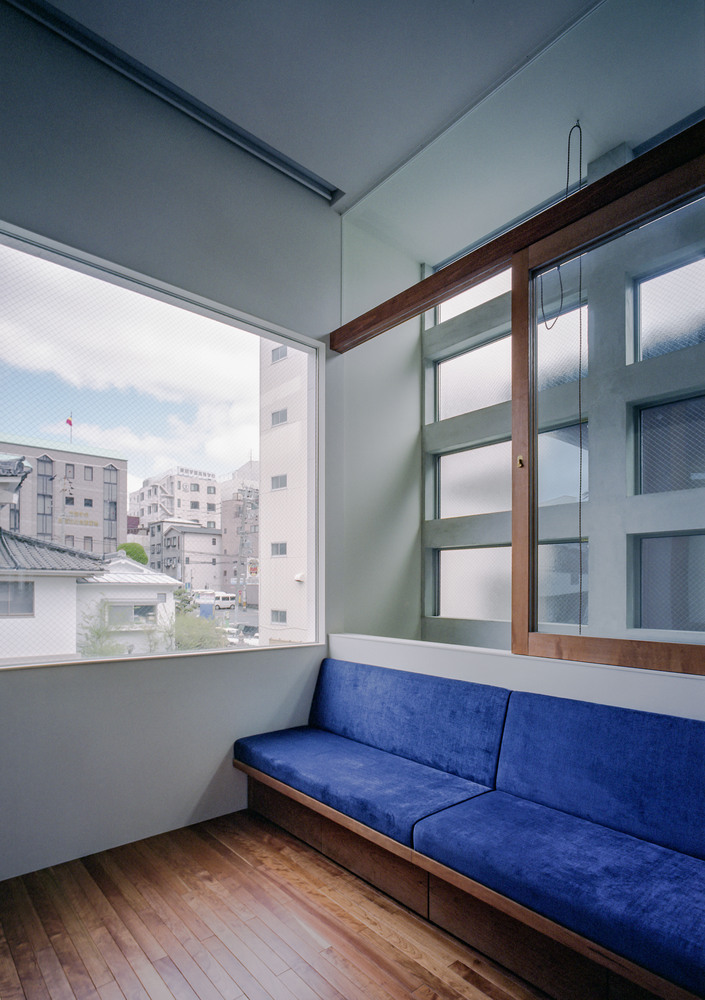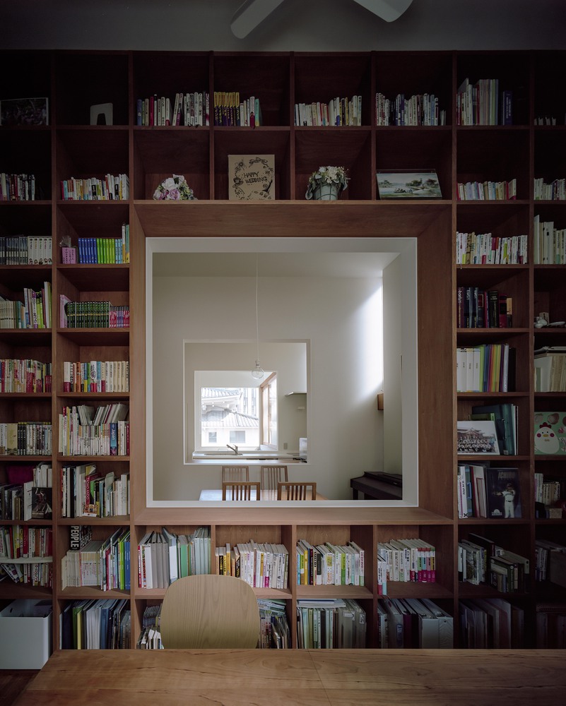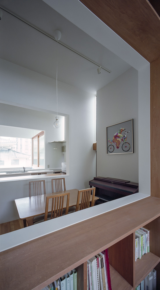 고층 건물들이 들어서있는 오래된 오사카 시내의 길고 좁은 대상지에 자리잡은 조그만 주택은 자택근무 빈도가 높은 맞벌이 부부와 그 자녀로 구성된 클라이언트의 요청으로 가족과의 연결감을 유지하면서 일할 수 있는 공간으로 계획되었다.