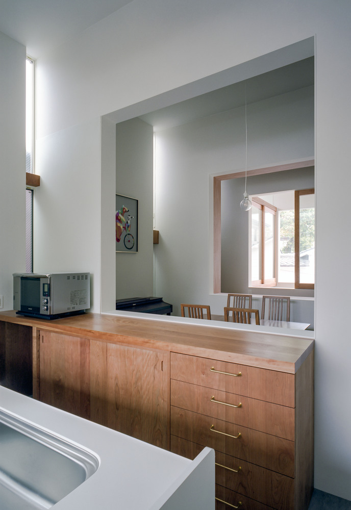 The second floor is devoted to shared spaces including the living room, kitchen, dining room, home office, and Japanese-style room. These rooms are divided by walls, but in the center of each wall is an opening that offers views through the other rooms to the outside. This separate-but-connected design allows the residents to sense one another’s presence as well as the expansiveness of the space beyond the openings.