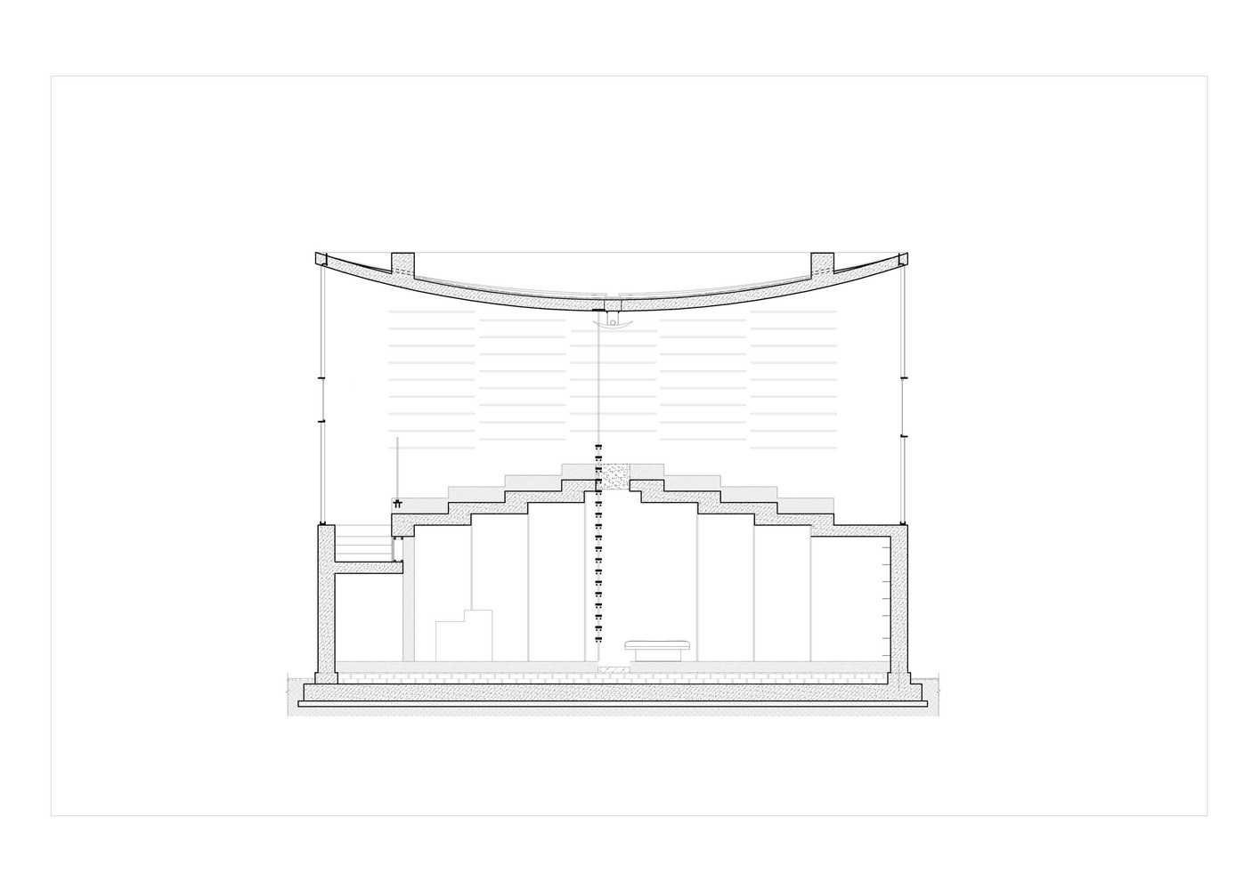Curved Slab Overlap: A Structure with Multiple Meanings. The whole building is a simply-supported and single-span structure. The concrete slabs are bent by gravity and then stacked together, forming secondary beams at the point of overlap. All the slabs are bent and stacked, forming a slightly upward curved span. Bending upwards in the longitudinal direction and deflecting downwards in the transverse direction, the structure shows a certain symmetrical relationship. The roof slab curves downwards, squeezing the space towards the aperture. In addition, the skylights along the sides of the walls compensate for the internal lighting and become apertures in the curved surface.
