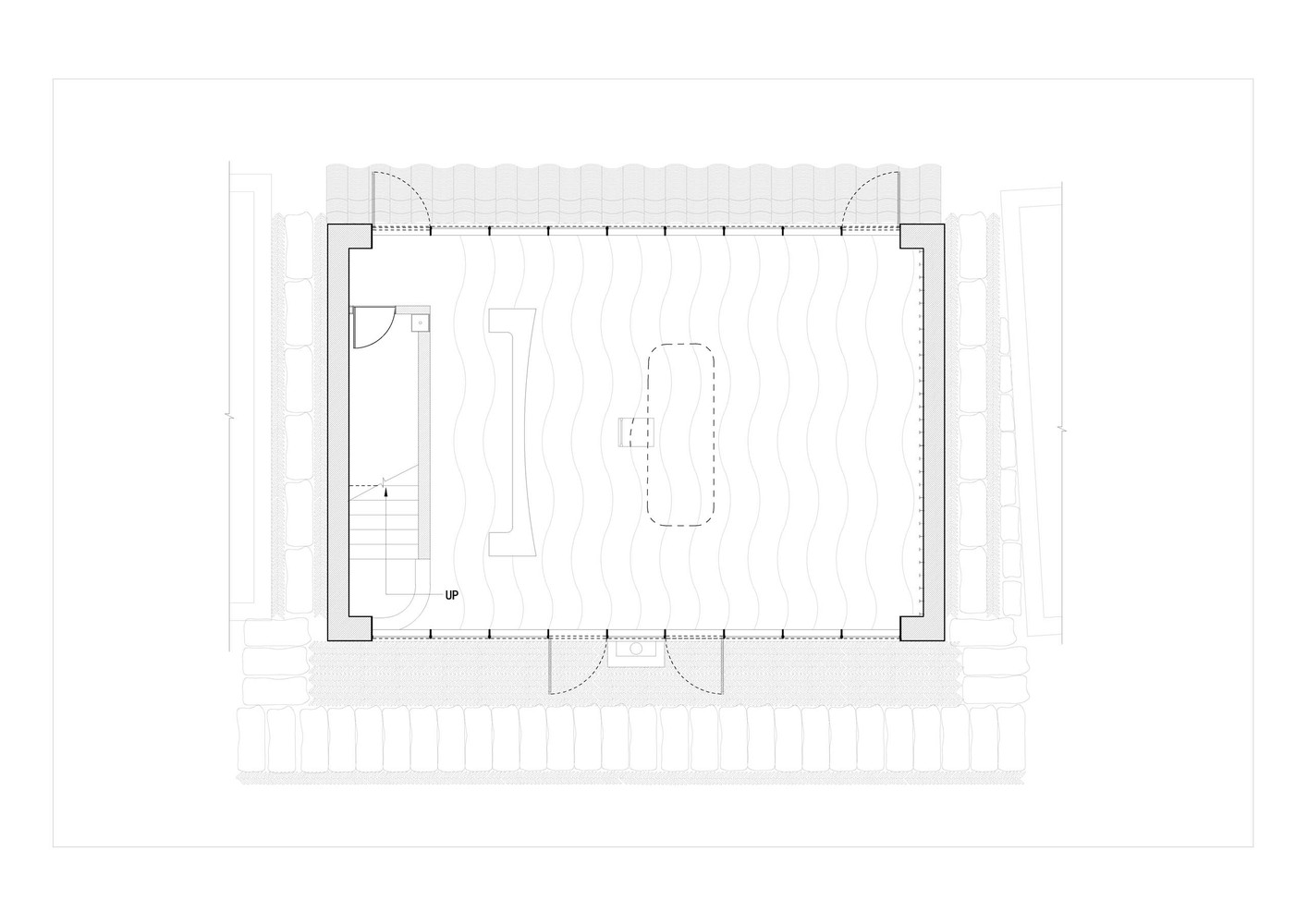 The floor and roof are cast in concrete in one piece. All pipes and light fittings are pre-embedded in the structure. Due to the 'Curved Slab Overlap' construction, the space on the ground floor seems to be squeezed by gravity to spill outwards, reinforcing the spatial prototype of the covered bridge. The space on the first floor, on the other hand, is naturally formed with staggered pedestals that conform to the scale of sitting but also have the dynamic of the enclosure, which, together with the staircase to the sky, suggests a certain spirituality.