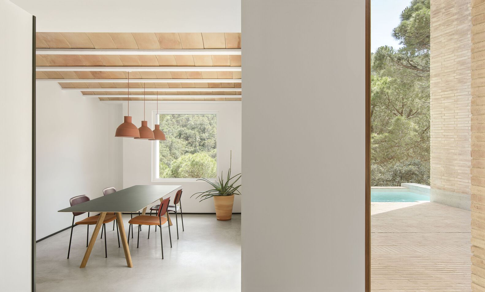 The house is organized around a double-height patio space that is shaded by a pergola of concrete beams and offers a framed view of the mountains opposite.