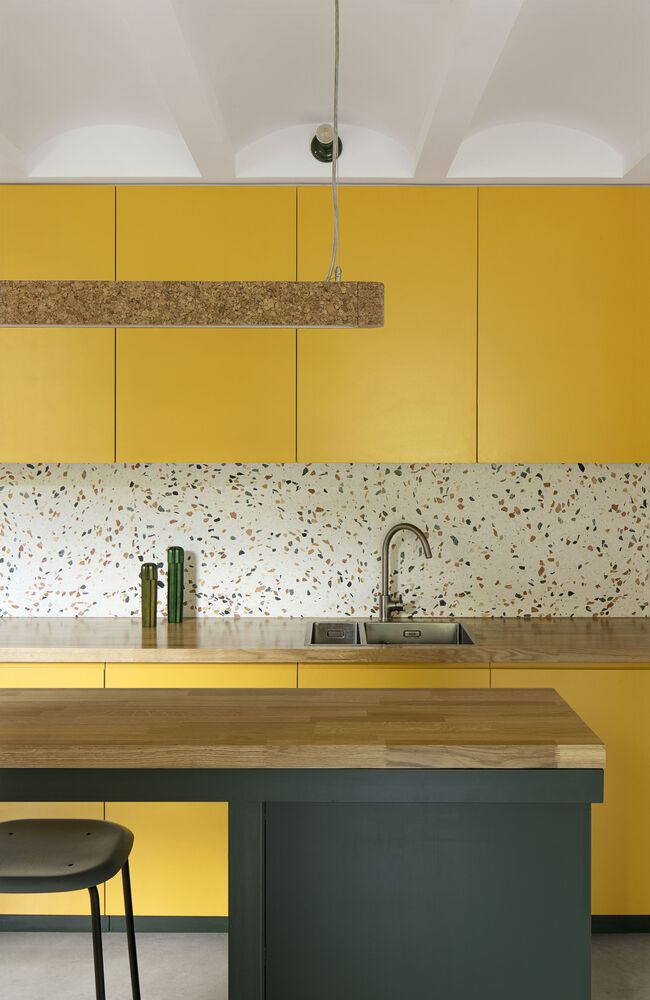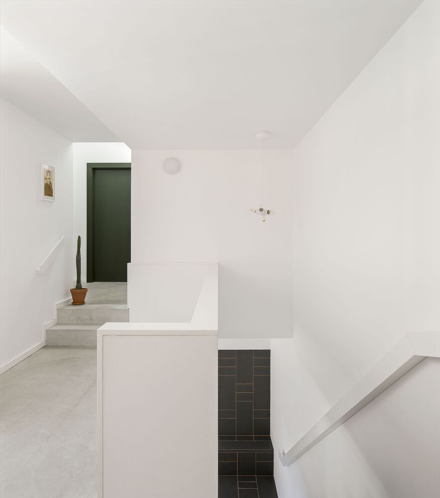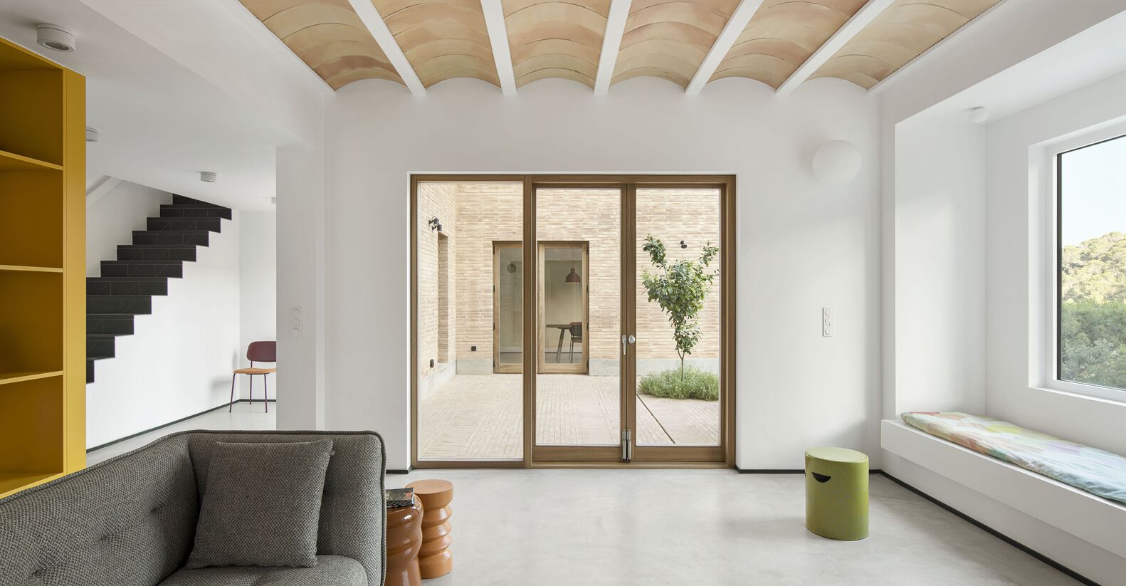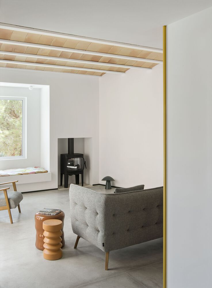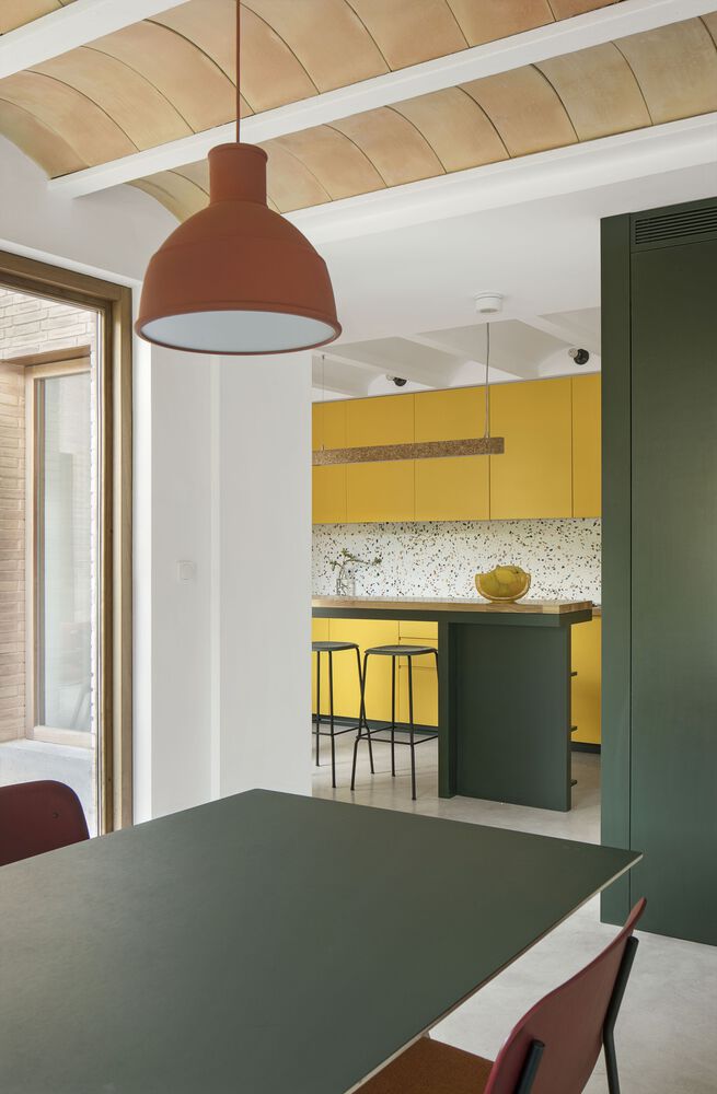 The project is largely constructed with locally sourced clay materials, such as ceramic vaults, bricks, quarry tiles, and glazed tiles. Their natural hues are set off with white plaster and are combined with various joinery items painted in artificial tones of green and amber, linking the interiors to the surrounding pine trees.