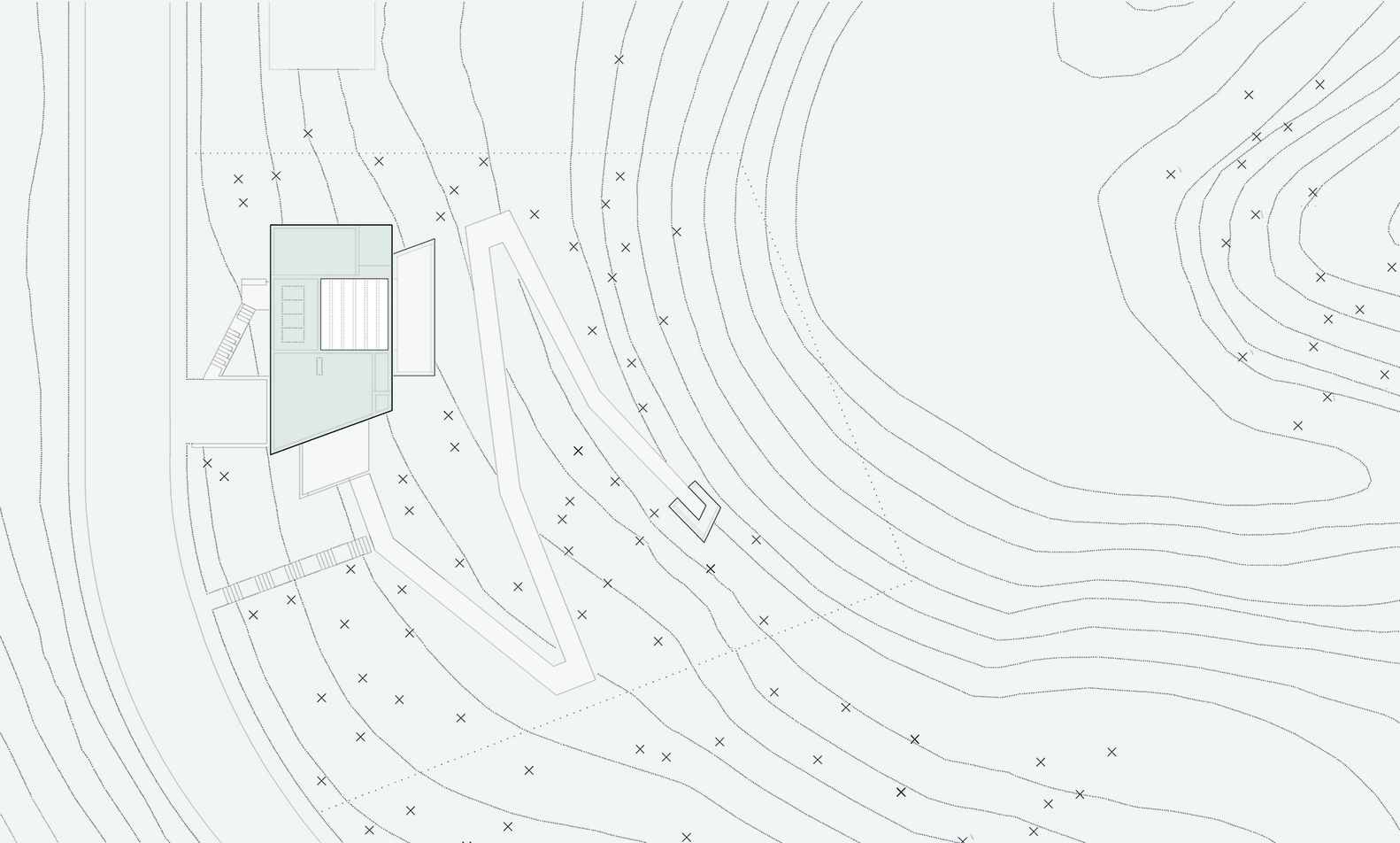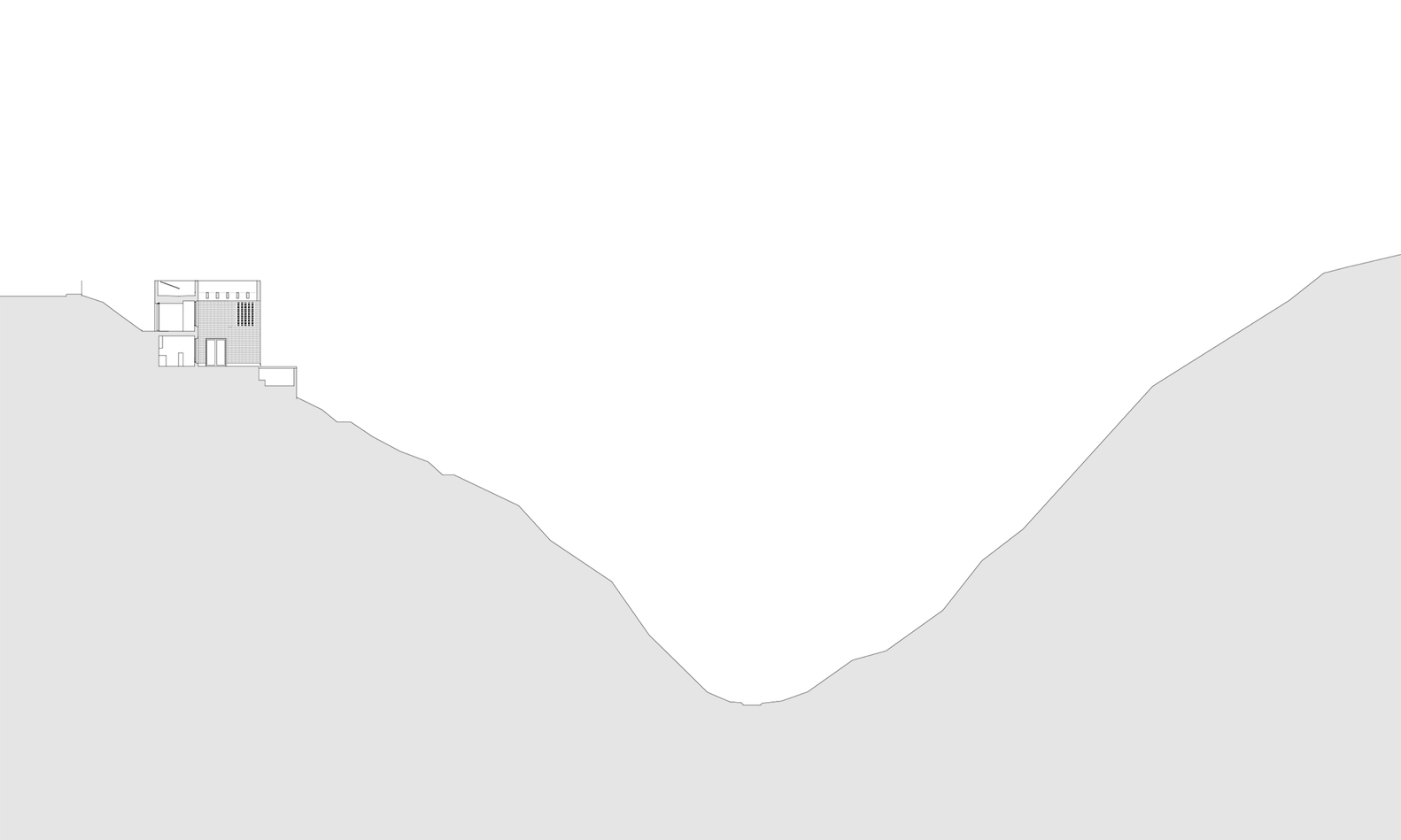 From the street to the top of the hill steps descend to the upper-level entrance door. All spaces in the house vary in proportions, and each room has a window with a different configuration of its glazing and threshold. All are modestly sized to limit solar gain, with the patio giving a second aspect to most rooms. The elevations are the resultant expressions of the various framed landscape views from these interiors, of which the patio opening is the largest.