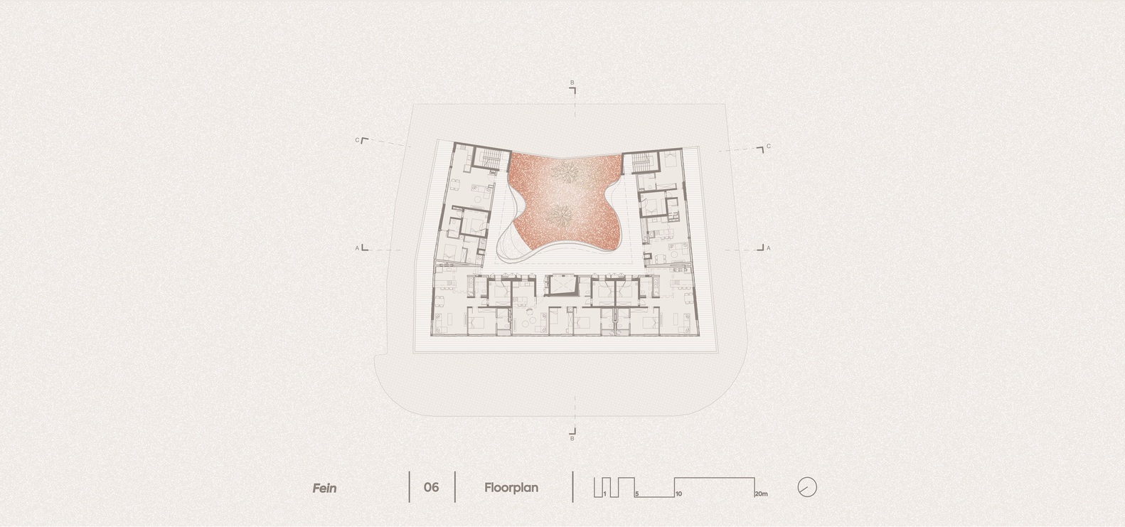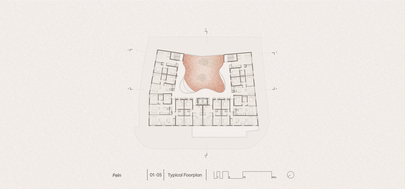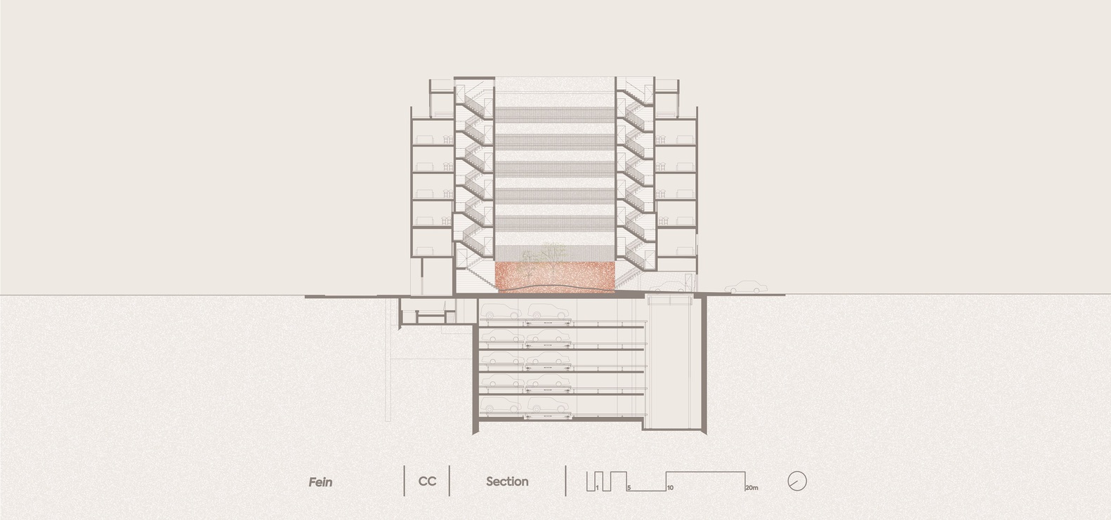 Fein 1 Central contains medium to small apartments, incorporating 53 apartments comprised by 49 two-bedroom apartments, 3 three-bedroom apartments and a 1 four-bedroom apartment. The scale of the apartments is allowing young families and young professionals – a major affordable housing local demographic, to remain in the neighborhood. In addition to the residential use, the building includes 9 retail units while incorporating 350 m2 of existing fragments from the old structure.