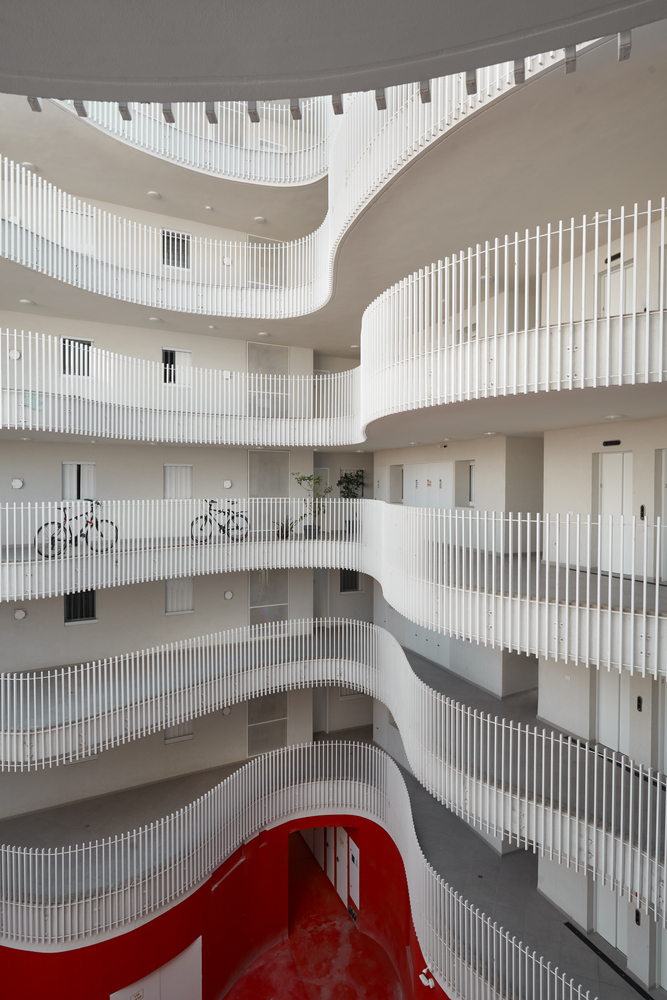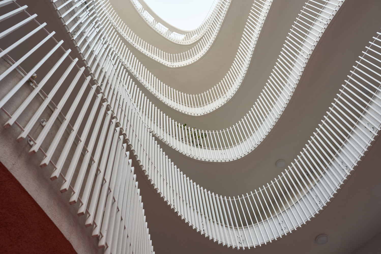 The new 6,400 m2 six-storey building introduces an inner courtyard, which becomes the focal area of the complex, allowing for large common balconies that are open to the sky. Fein 1 Central has a strong community character from its beginning since it was initiated and built as a co-op residential project. The apartment complex maintains a strong community spirit by featuring generous shared spaces, such as the red courtyard area and large curvaceous balconies that serve both as pathways and leisure spaces for residents. These meeting and gathering spaces are key elements in promoting and sustaining the residents’ community culture. The courtyard, apart from offering valuable community space, it also contributes to a more sustainable living, as it promotes low energy consumption by offering shading in the summer and penetration of direct sunlight in the winter.