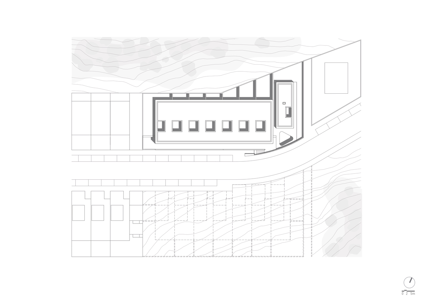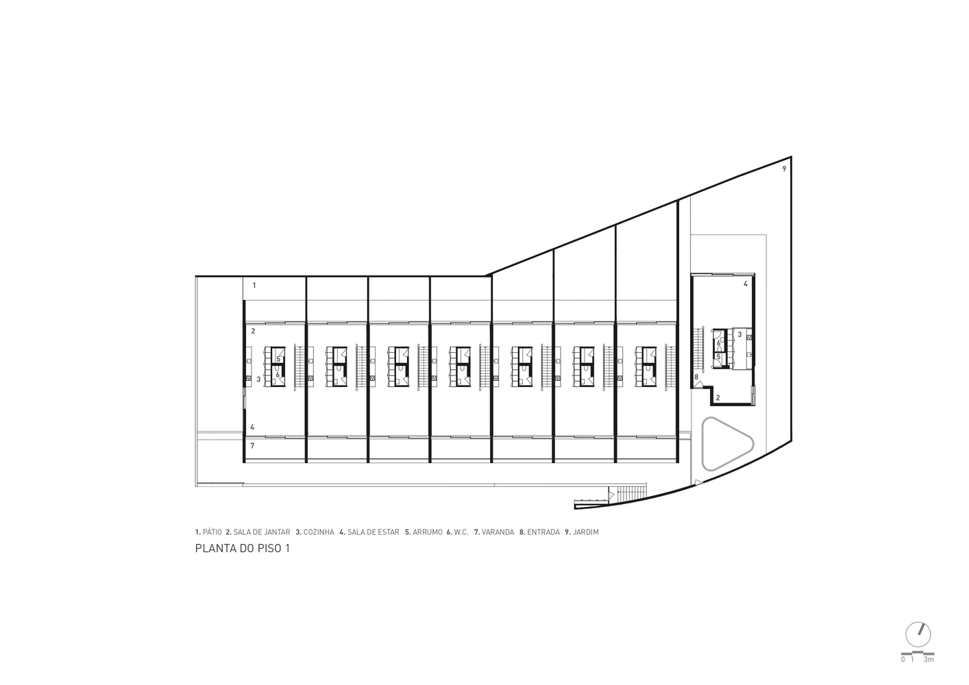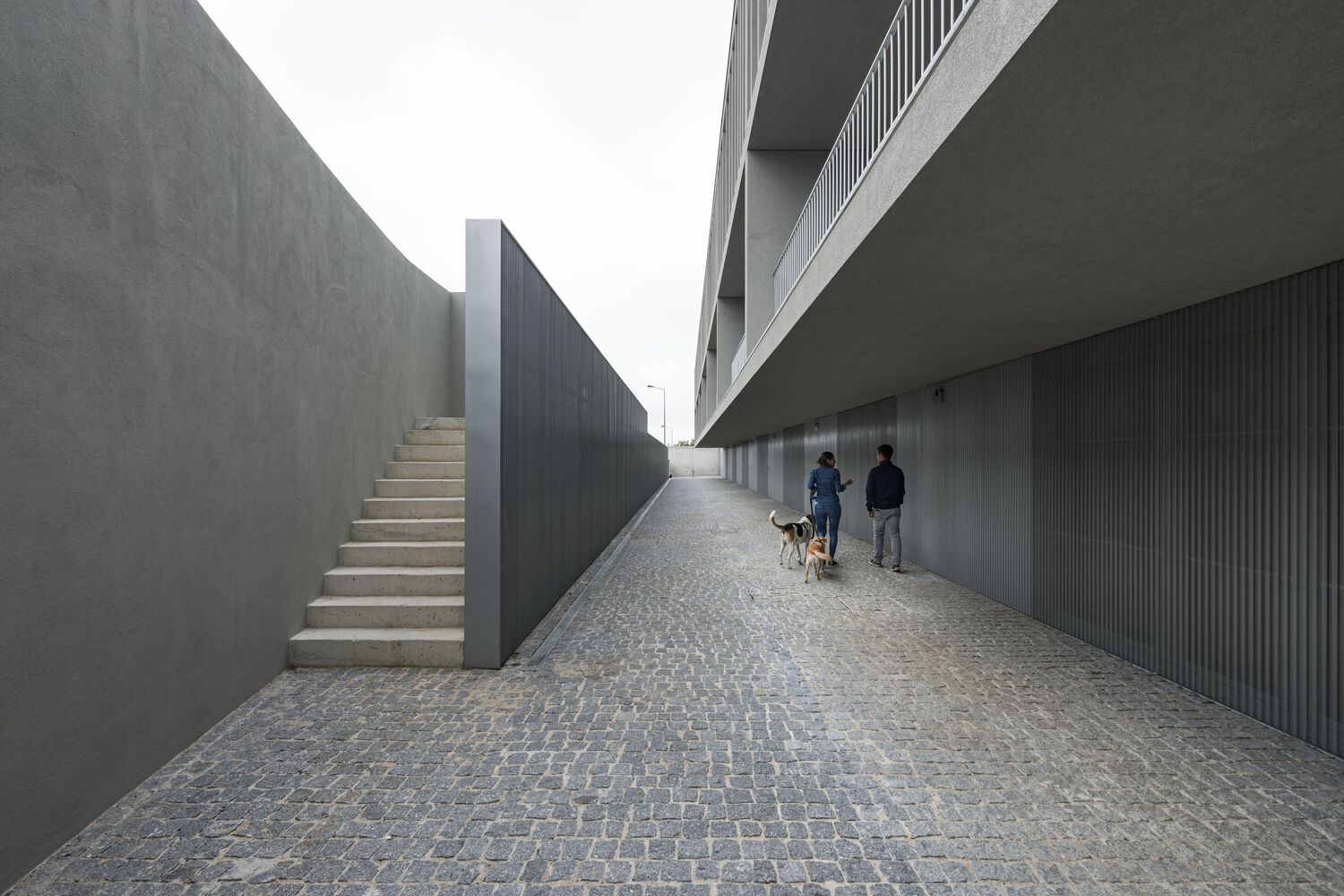 Our proposal redefines this existing allotment plan by transforming the seven houses into eight units unified in a single block anchored to the topography and one single house, to the east, that adjusts to the street’s curve. The access to the housing block is possible, at the west and lower level through an exterior pedestrian gallery parallel to the street that also connects to the common car acess to the individual garages. The pedestrian gallery is also accessible, from the street, at the opposite side, to the east, via a staircase where one also finds the single direct access from the street to a unit, to the single and detached house