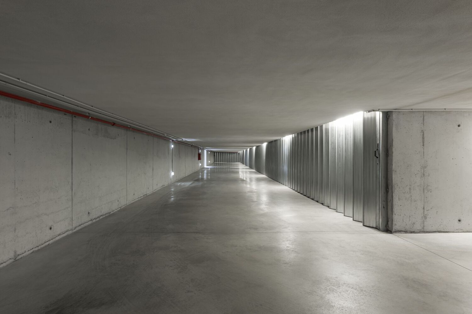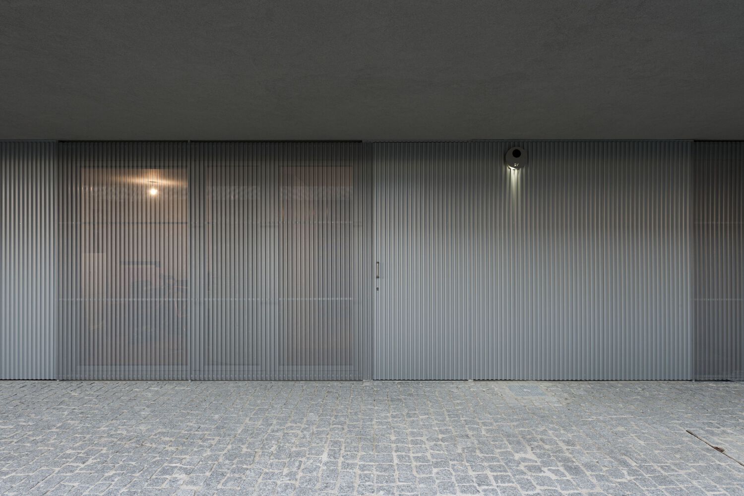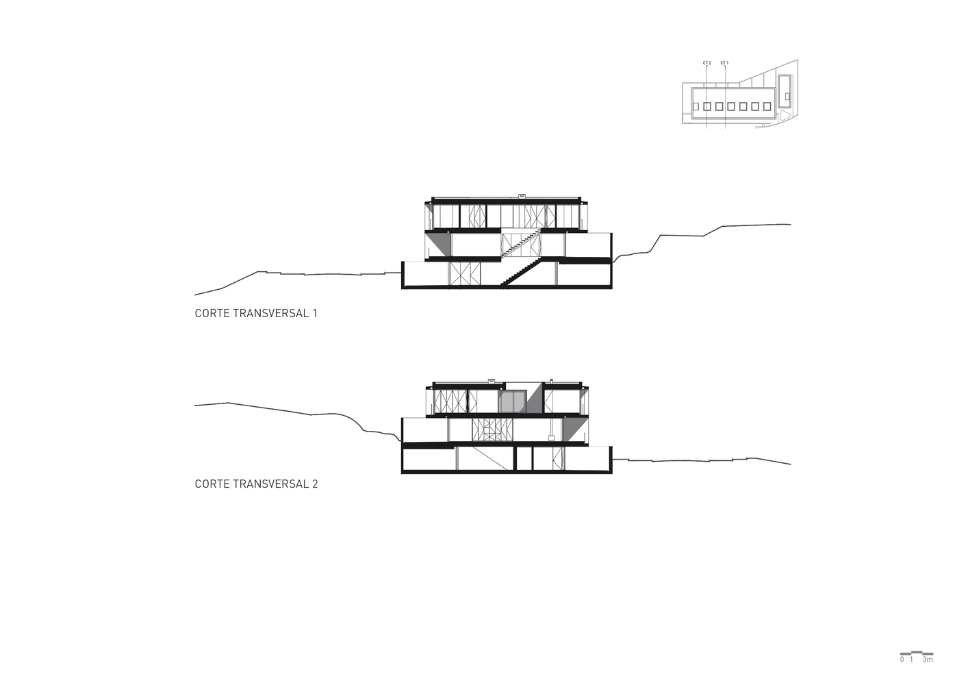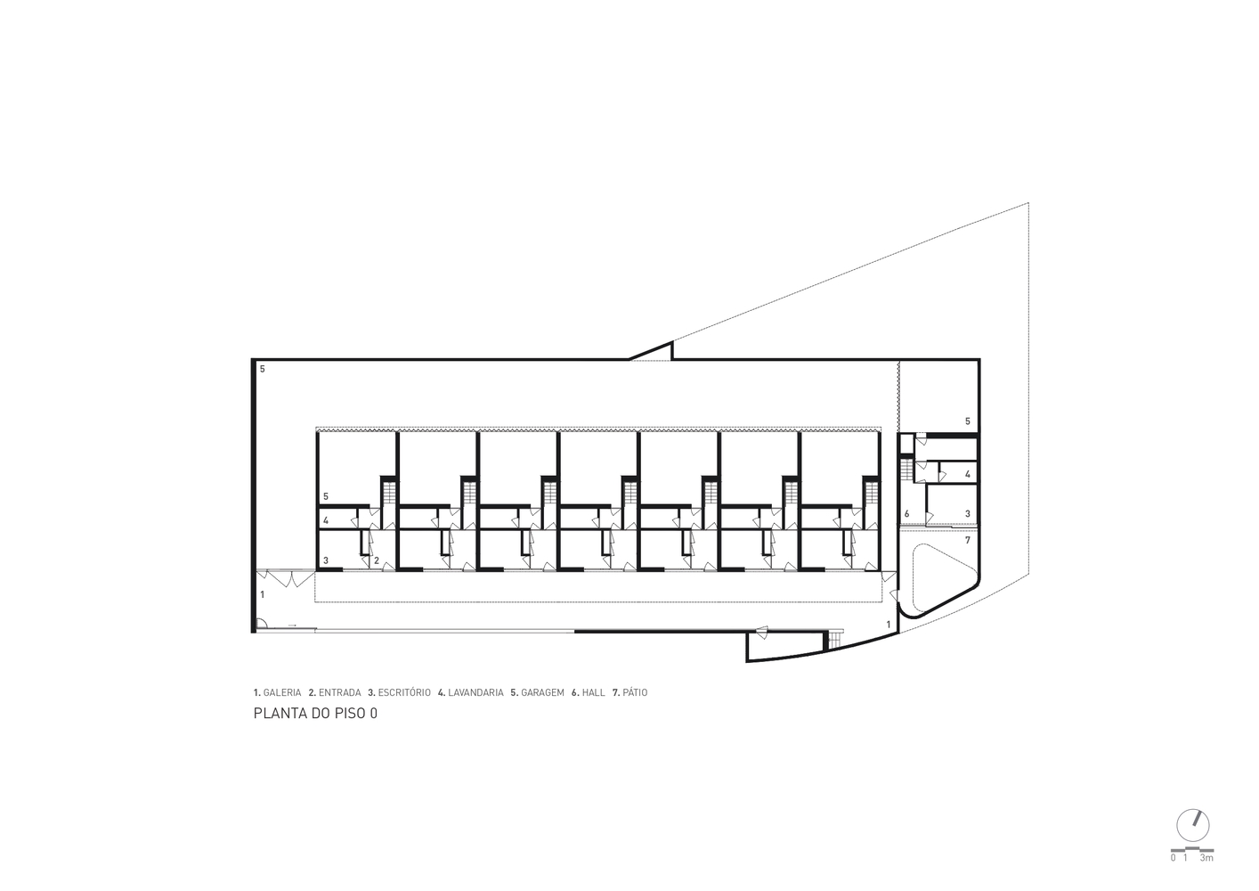 Our proposal redefines this existing allotment plan by transforming the seven houses into eight units unified in a single block anchored to the topography and one single house, to the east, that adjusts to the street’s curve. The access to the housing block is possible, at the west and lower level through an exterior pedestrian gallery parallel to the street that also connects to the common car acess to the individual garages. The pedestrian gallery is also accessible, from the street, at the opposite side, to the east, via a staircase where one also finds the single direct access from the street to a unit, to the single and detached house