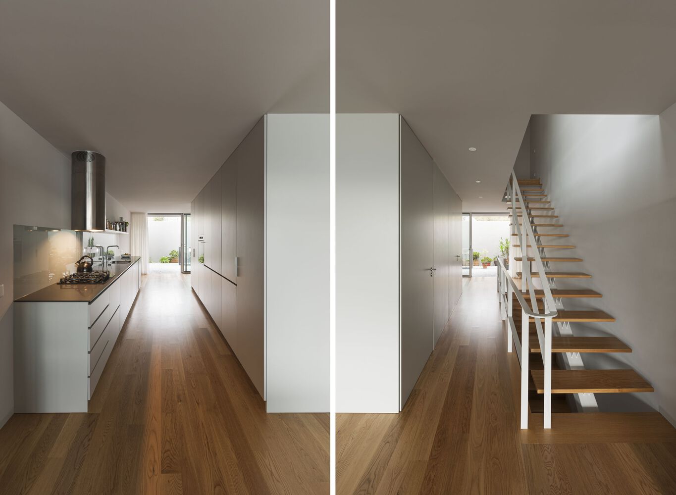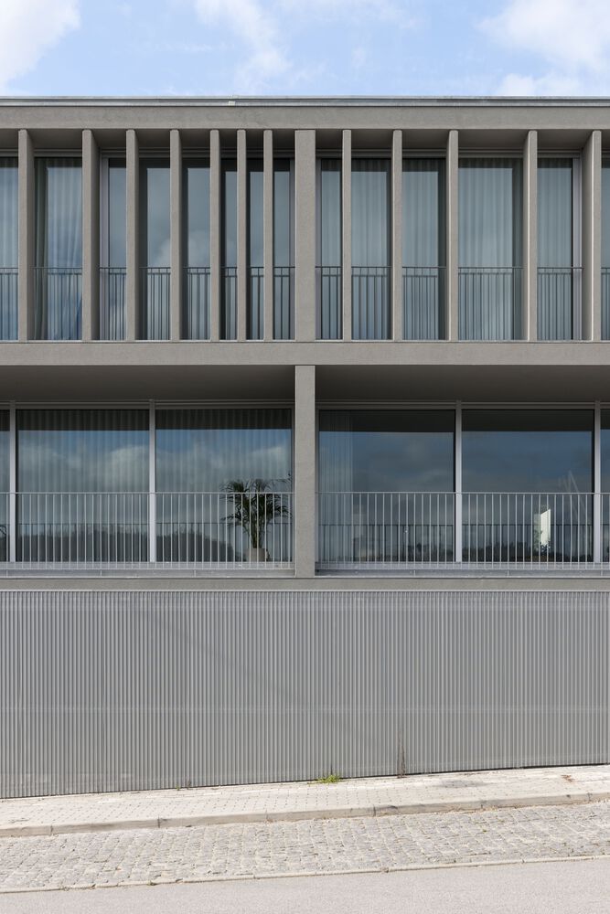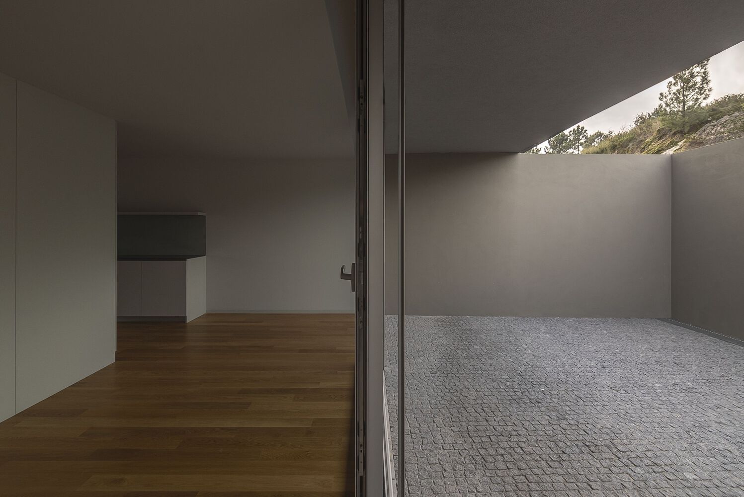 This option allowed us to optimize the available construction area as it fits the existing topography and grants that each individual house possesses an individual entrance, access to the common areas, an individual garage for two vehicles and, at the floor 1, an open-space defining a kitchen, dining room, with an exterior garden, and living room spatially extended by the balcony in the southern facade. The most private program of the house - the bedrooms - is reserved for the upper floor, from which we highlight the main bedroom suit, facing south, with several concrete brise soleils that operate as shadow devices. The introduction of an inner patio in this floor allowed a third bedroom; it also acts as a natural light, ventilation system and natural heating, taking advantage of the sun exposure.