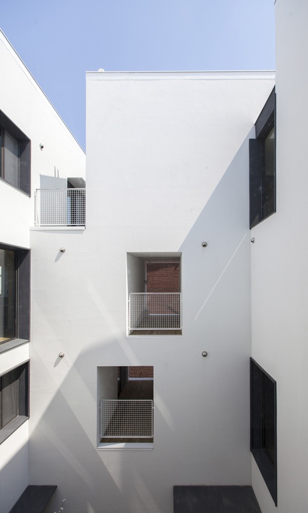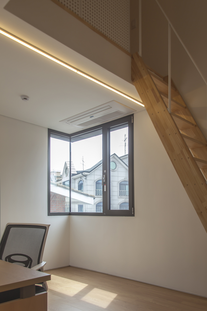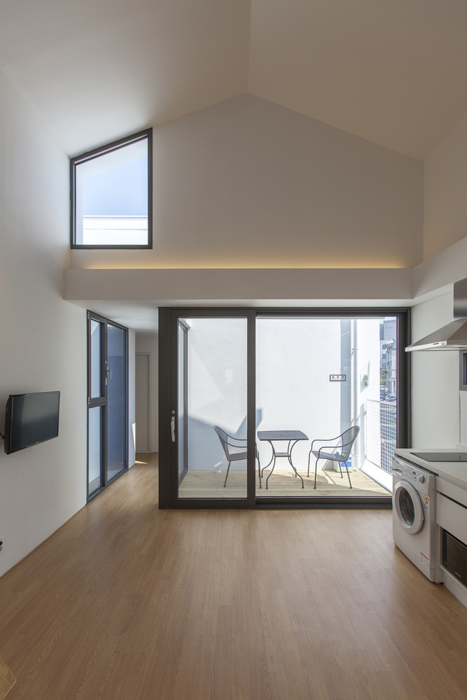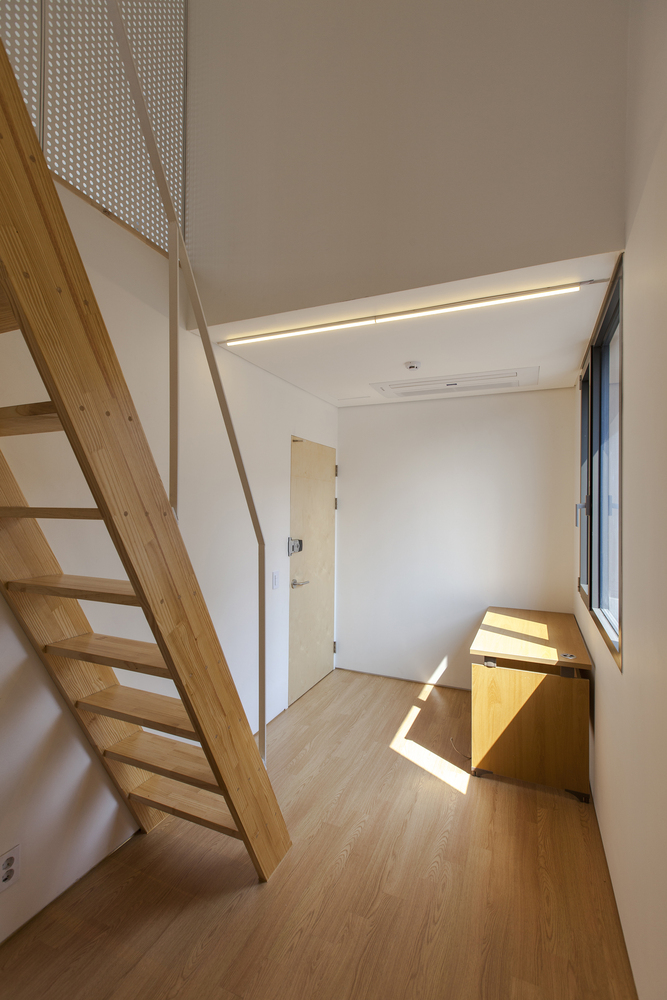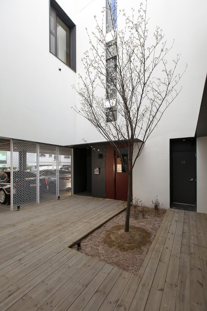 One large sized ‘Gap’ is a courtyard - a sharing open space through easily accessible pilotis. The front and rear façade get advantage of air ventilation and natural sunlight from the south through ‘the Gap’. The courtyard is originally inspired by a low wooden bench with deep, green shade under Korean zelkova where villagers used to gather. There also become a sense of place where people who walk the ally like to stop by and sit to break and talk each other.