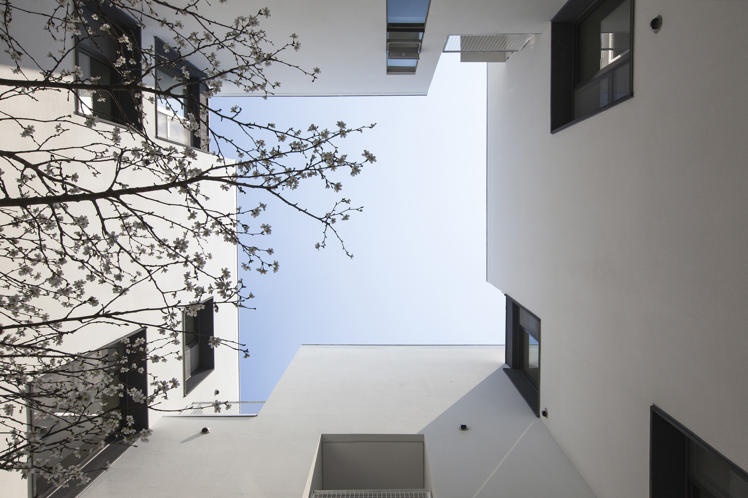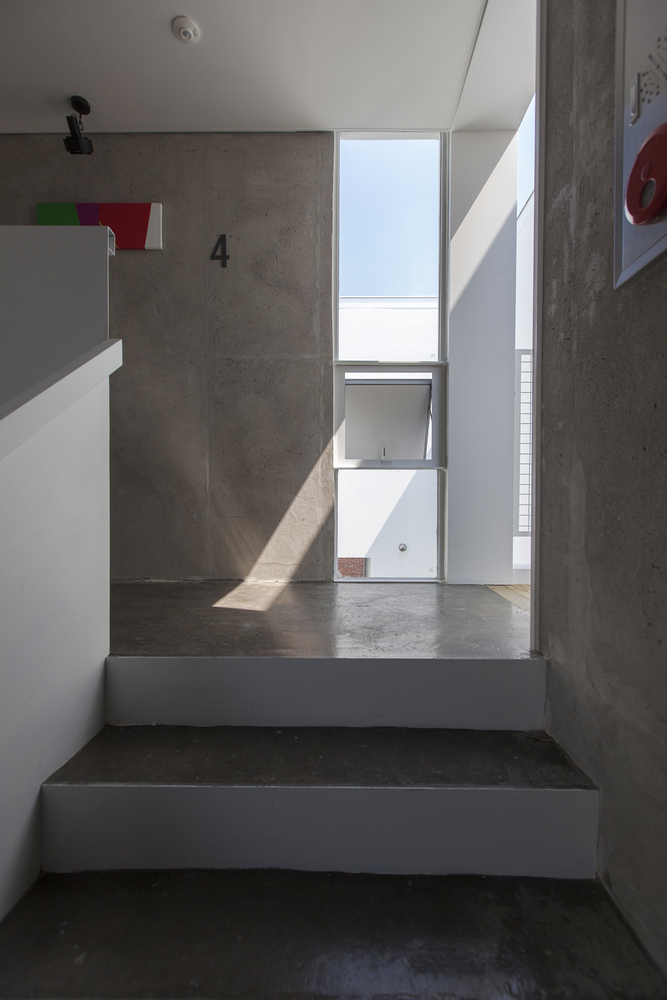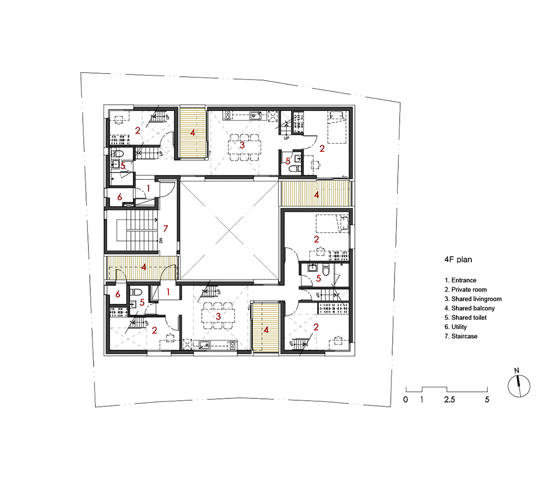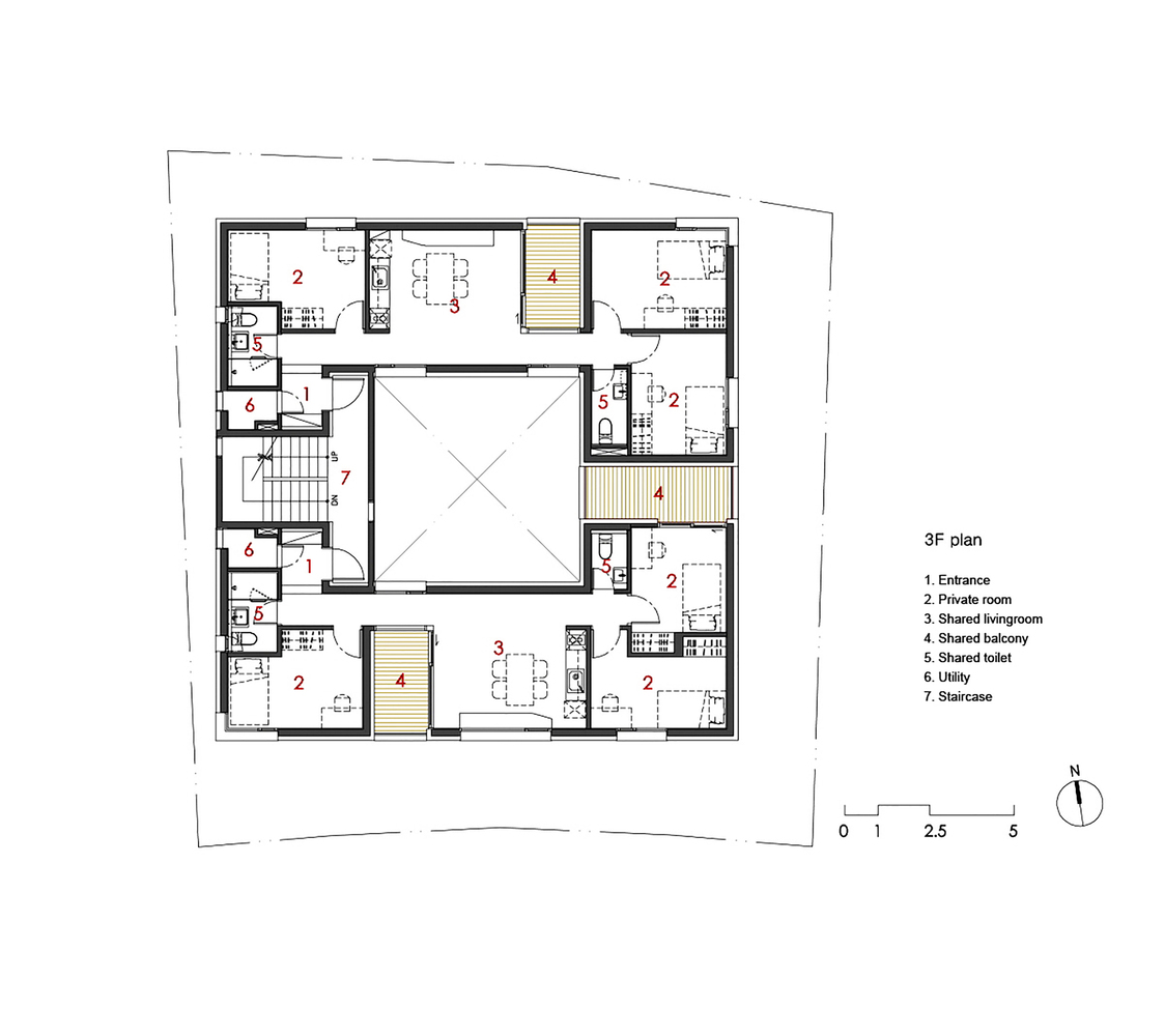 The courtyard makes this possible to design. In addition, each floor balcony is laid-out in a crisscross pattern to further enhance the privacy between floors.