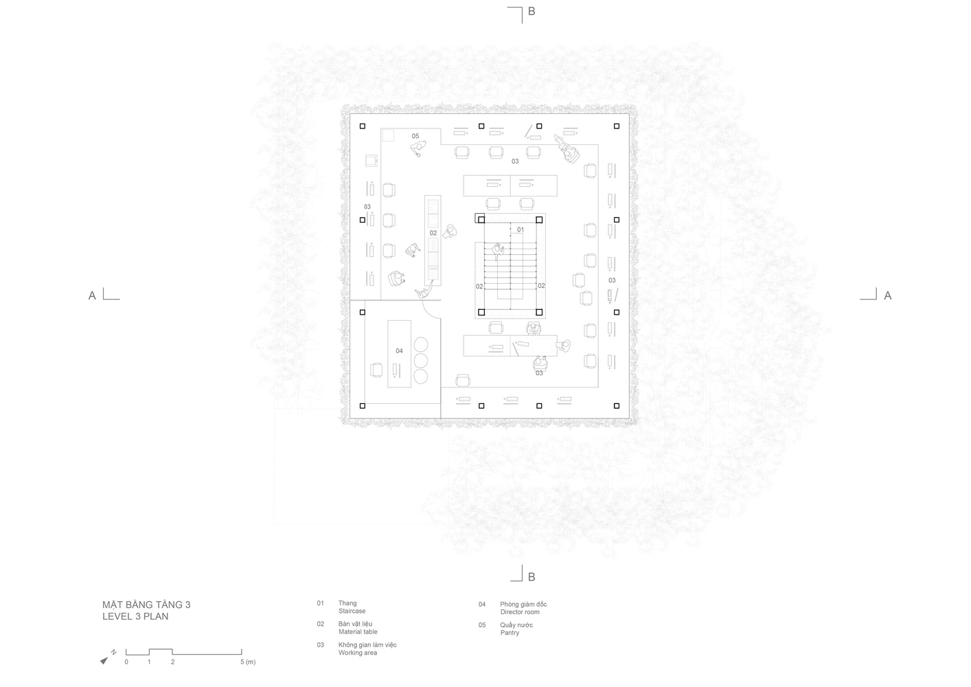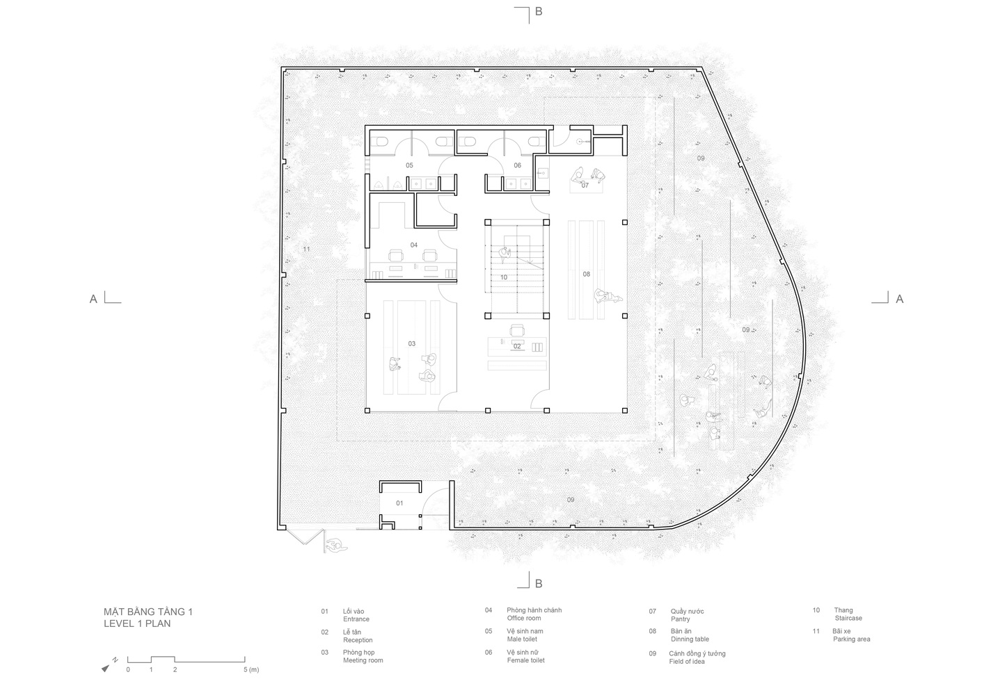 1층의 커뮤니케이션 공간은 과장과 순수함, 개방감과 영감이 넘치는 공간을 연출한다. 유리와 강돌로 정화된 '아이디어의 들판' 정원을 시각적으로 연결한 전형적인 베트남 건축의 현대적 기후적 응용을 시험해볼 수 있는 흥미로운 공간이다. 극단적으로 모든 사물은 사용하면 나타났다가, 활동이 없으면 사라지고, 눈에 띄게 순수한 풍경이 된다.