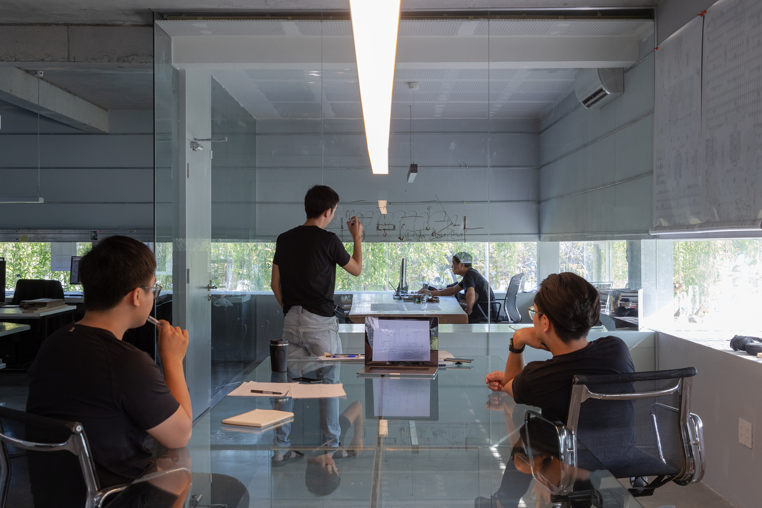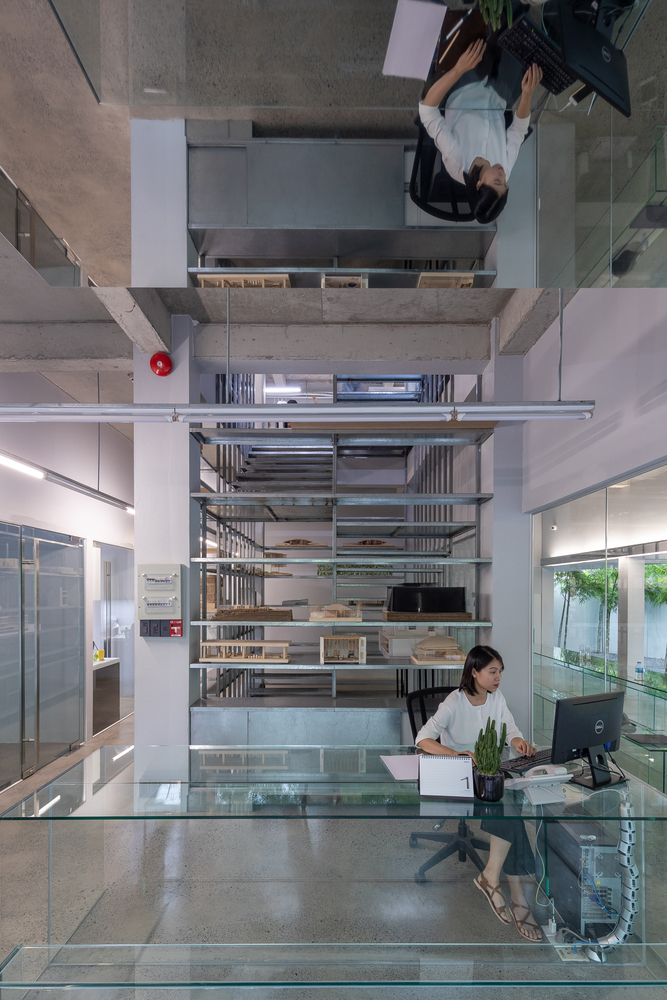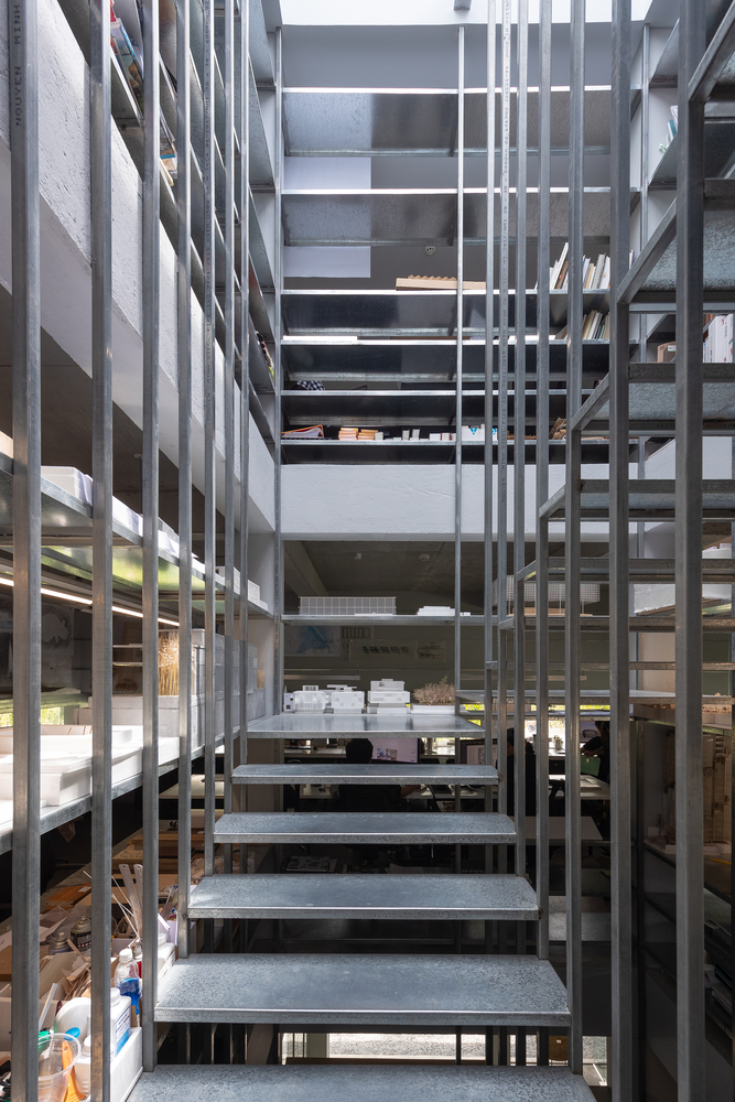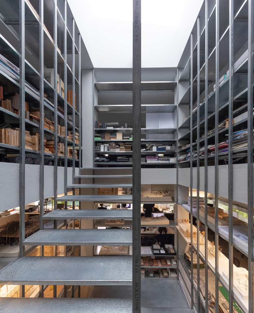 An open library is located right behind each architect's working space, physical models and material boards are carefully selected, well-organized into a lively creature from the center of the working space combining with each extended platform to be used as a vertical staircase. Since then, the "dynamic" and "static" gradient of the workspace are increased from bottom to top, decreased from inside out.