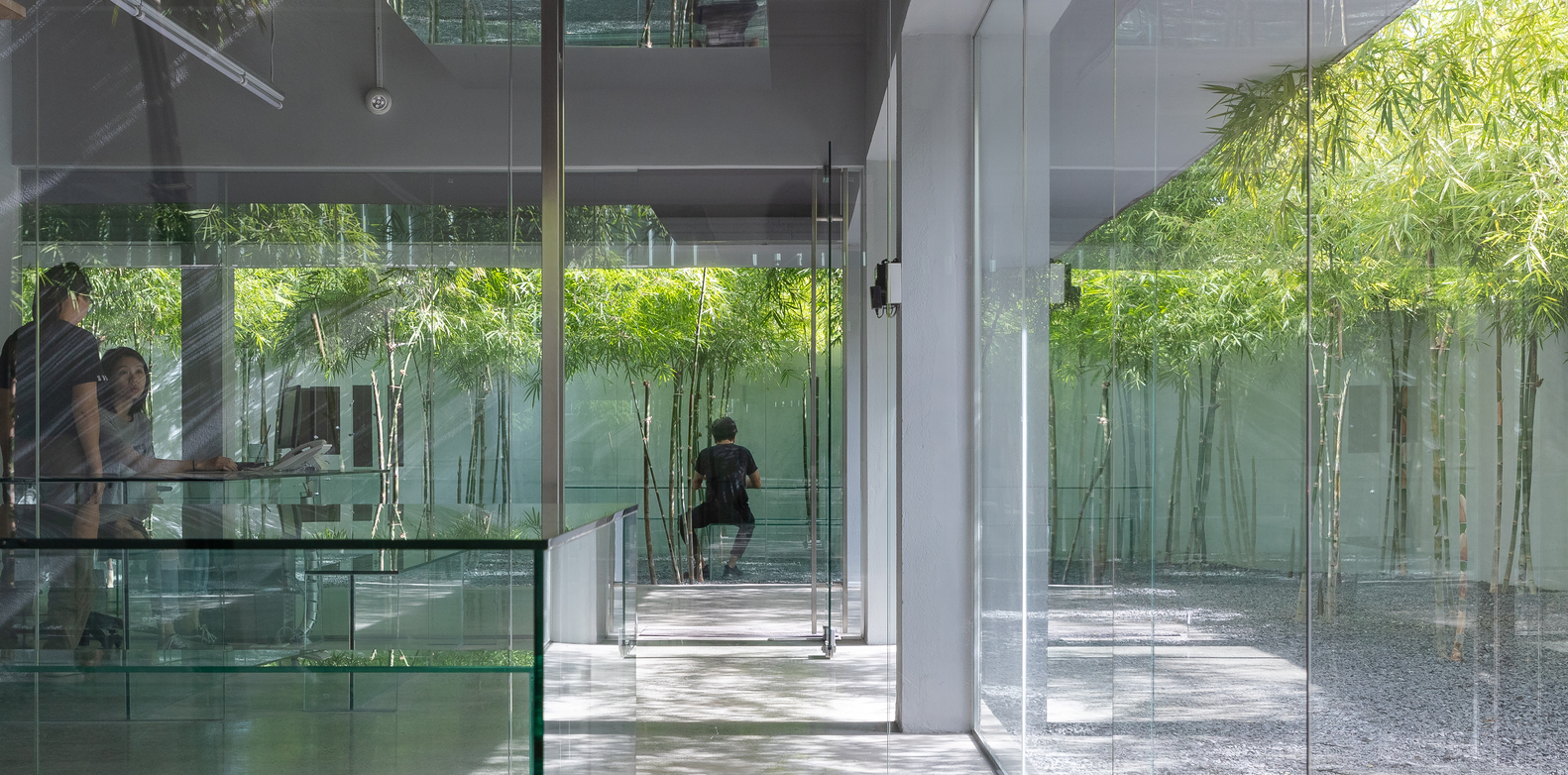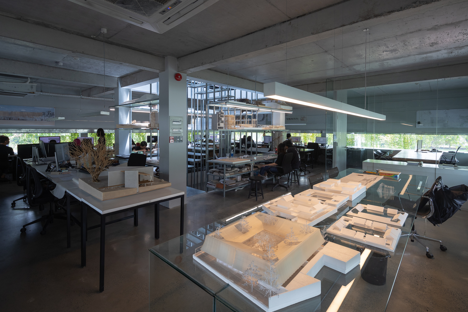 The architect always enjoys privacy with pleasure view to the greenery. That is why we expanded the working space with the view to the whole park from the window openings, which are moderately designed with suitable height to control the glare of tropical sunlight. These openings are surrounded 360 degrees the whole working space, 600mm in height from the working tables, the light is controlled just enough to cover the sun glare to produce a comfortable clear view of the park.