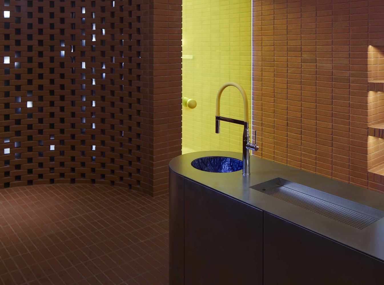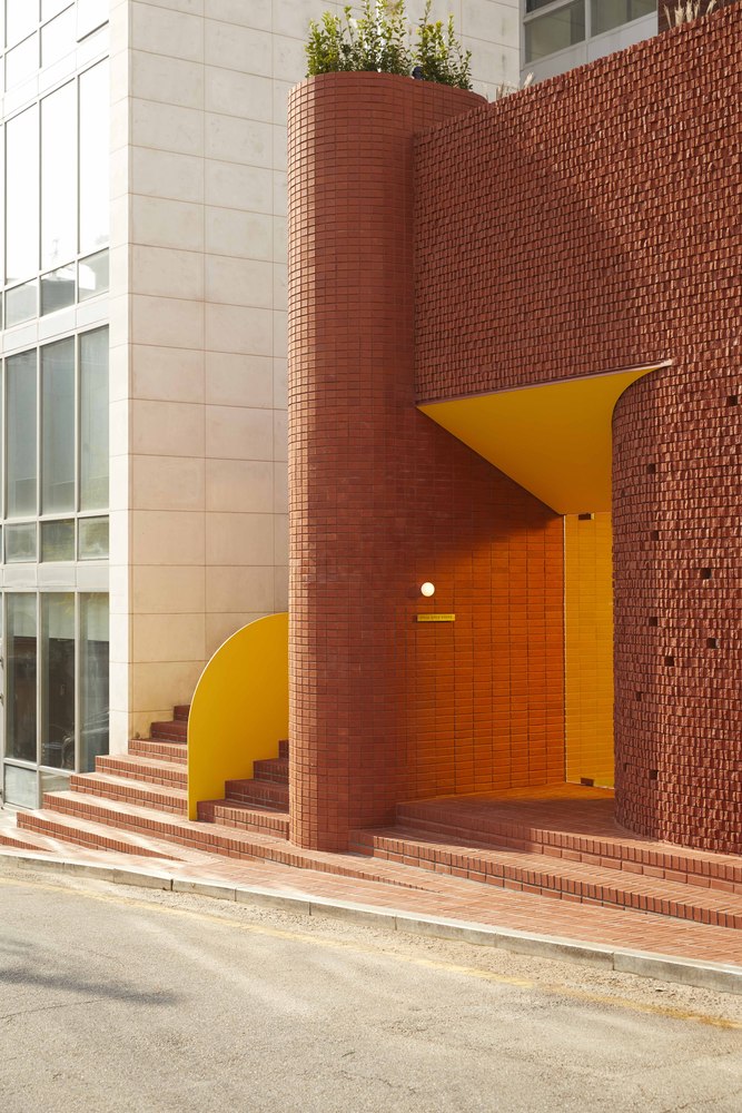 The main material of the space is red brick. The red brick is a material that contains universality and persistence and builds the structures by gathering small cells. The bricks, which are built with about 100,000 blocks, are like the conservative nature of materials that has been kept over the years, and the meaning of the corporate spirit which has developed steadily. The various construction methods and patterns of the bricks are performance that overcomes conservatism. Moreover, yellow is the symbolic color of the Ottogi. The yellow gives a completely different feeling depending on the color, brightness, chroma, area of use, so we decided not to insist on the brand’s symbolic color but to focus on delivering the image of the color. The materials used inside were wood, fabric, and ceramics that are suitable with the bricks, the main material. However, we used stainless steel for the rhythm of the material, thus, we cut every single segment so that it could feel the temporality.
