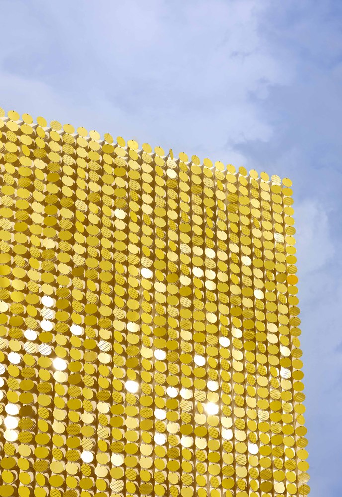 The panels of the metal nets were installed to the ceiling, so that lighting, heating and cooling equipment, and sound equipment are not exposed. A large sliding door installed at the front of the hall opens about 6m, so it connects the hall and the garden like a bridge. The sala, the last space, is not an open space for the public. But the sala’s front is exposed to the garden. On the front of the square, more than 4,800 yellow spangles respond to wind and light, reflecting the garden.
